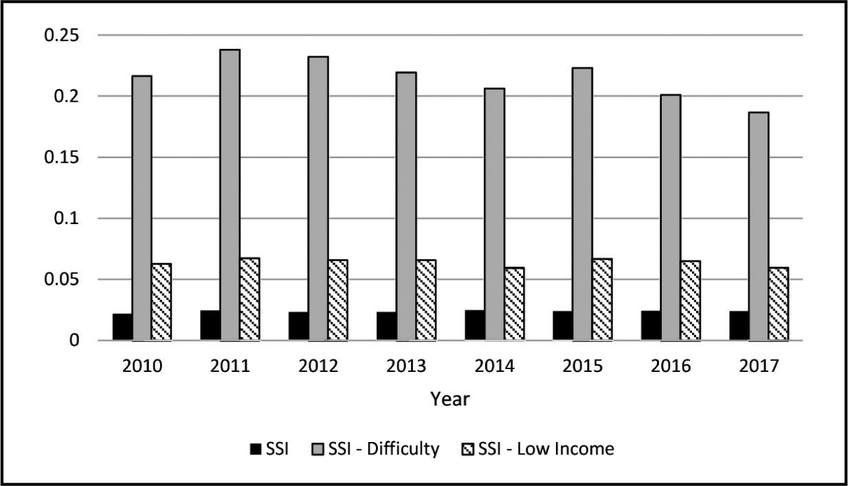 | SSI recipiency – low income | 0.06 | 0.03 | 0.07 | 0.00 | 0.06 | 0.00 | 0.276 |