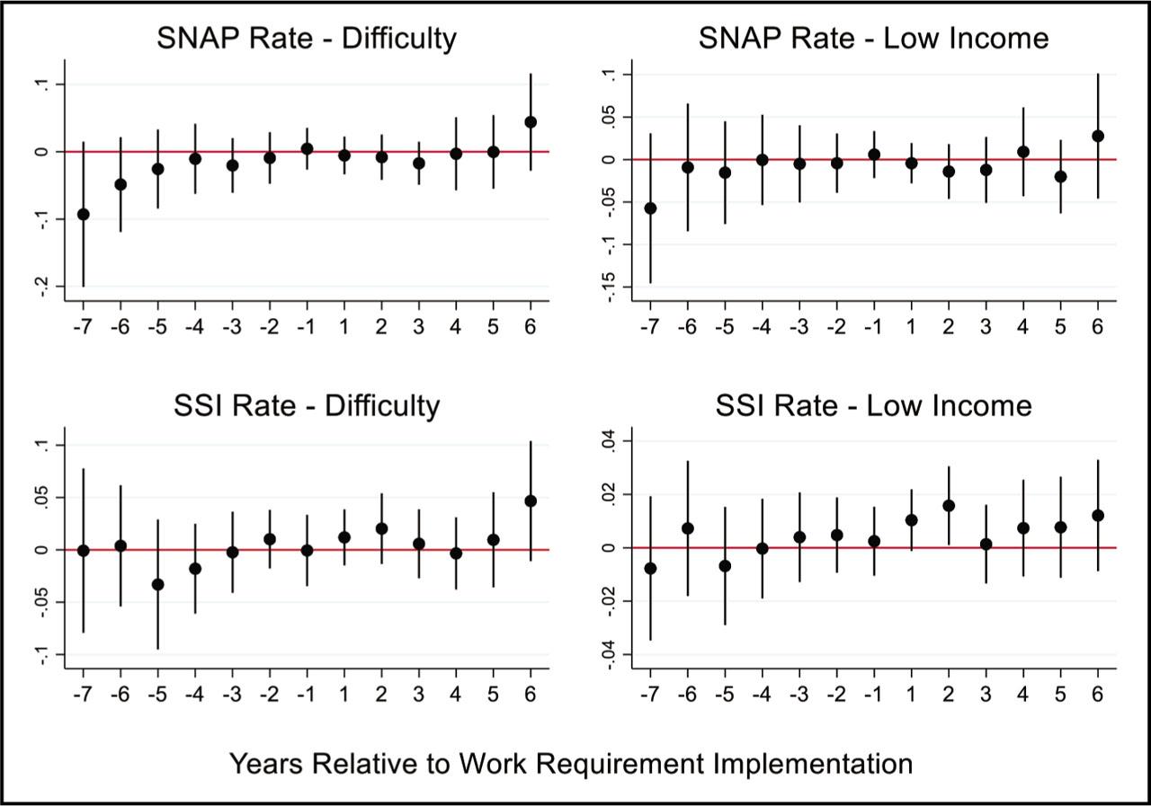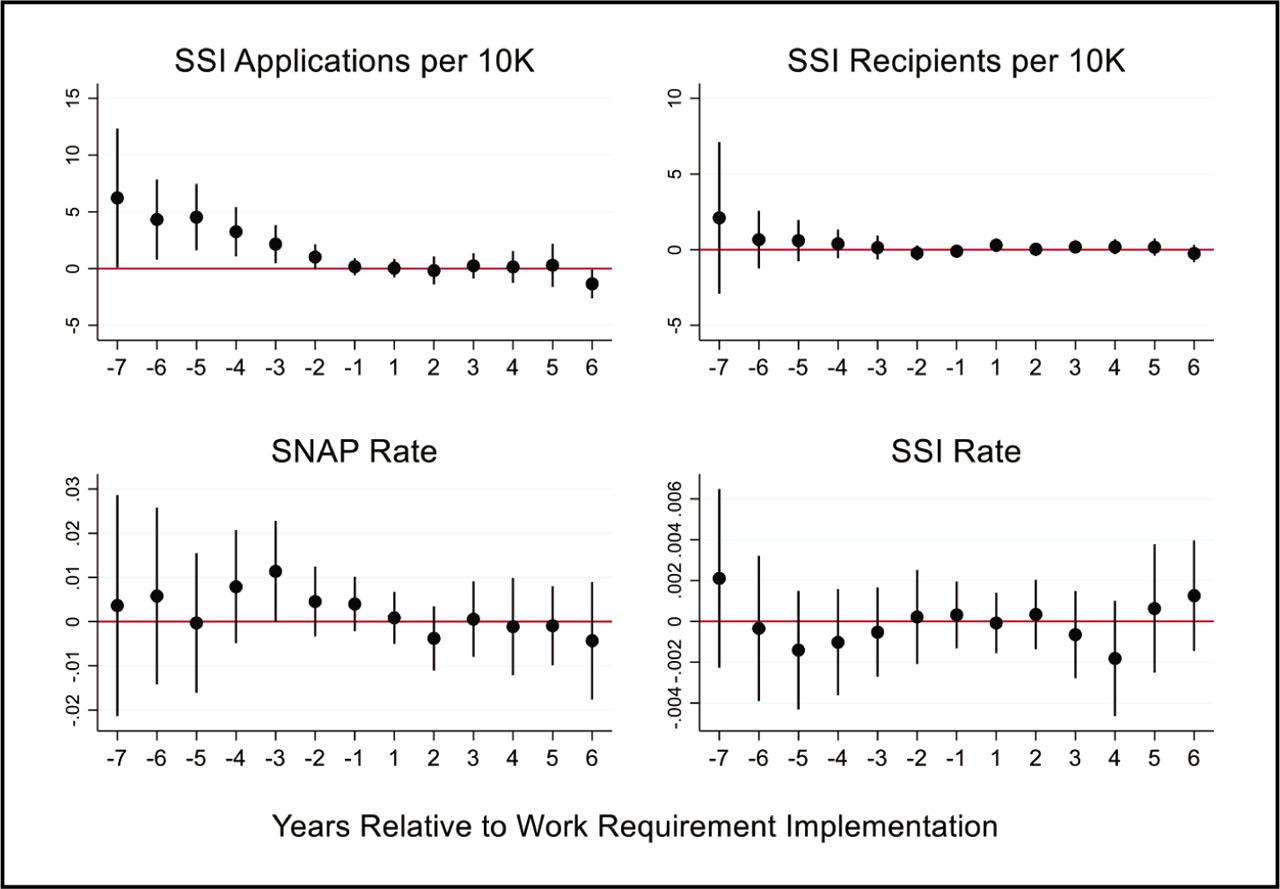 | Any work requirement | −0.013 (0.012) | −0.007 (0.011) | −0.001 (0.009) | 0.004 (0.005) |