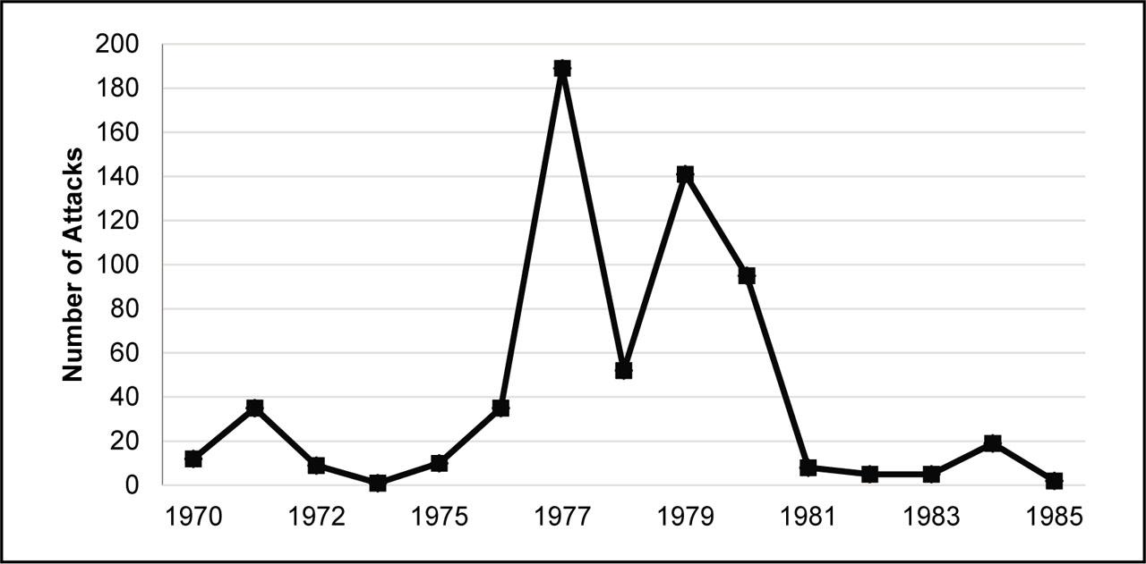 Number of terrorist attacks in Turkey (1970–1985).