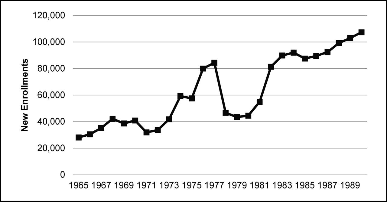 New enrollments in all higher-education institutions in Turkey (1965–1990).
