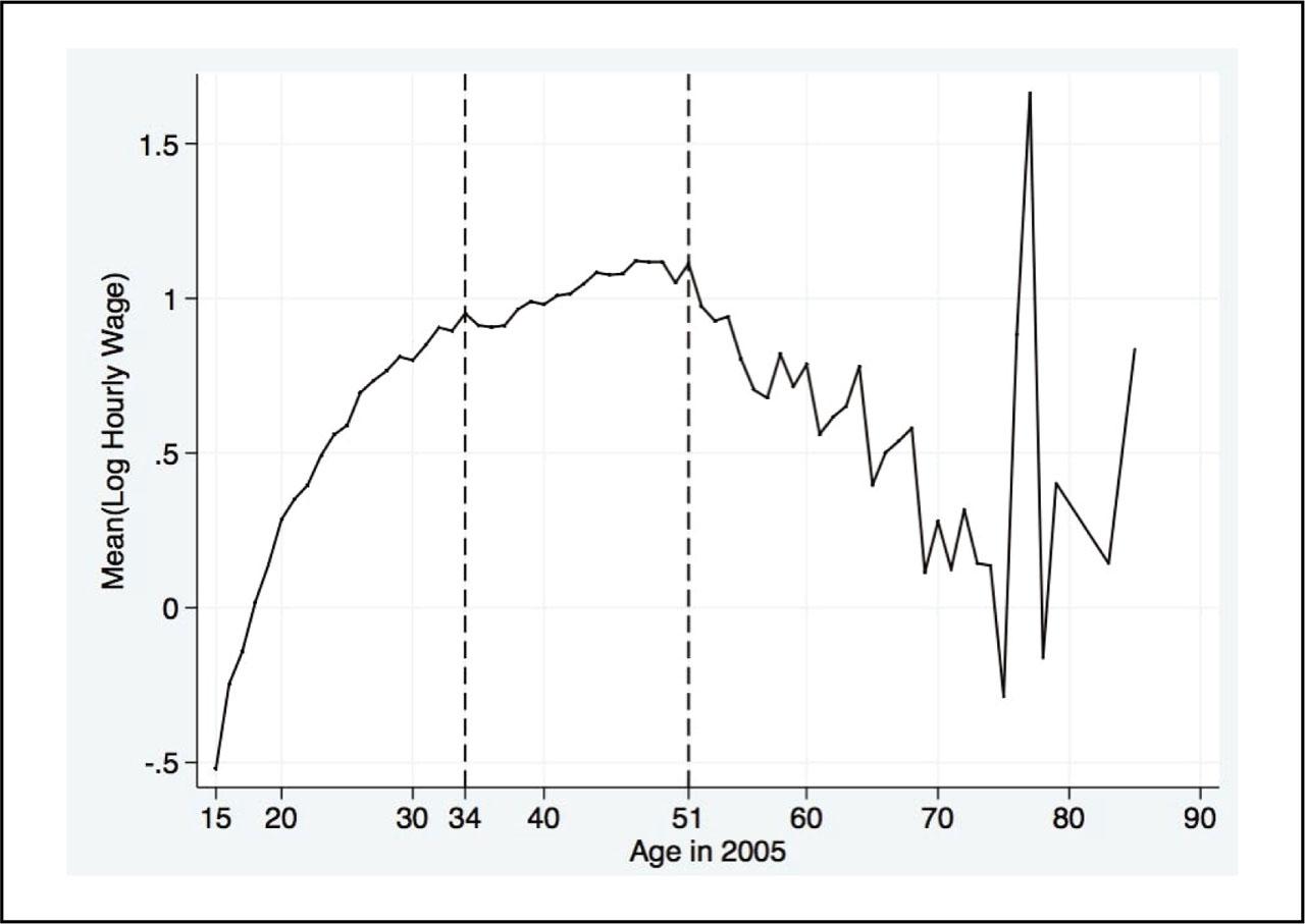 Average log hourly wages for men by age.