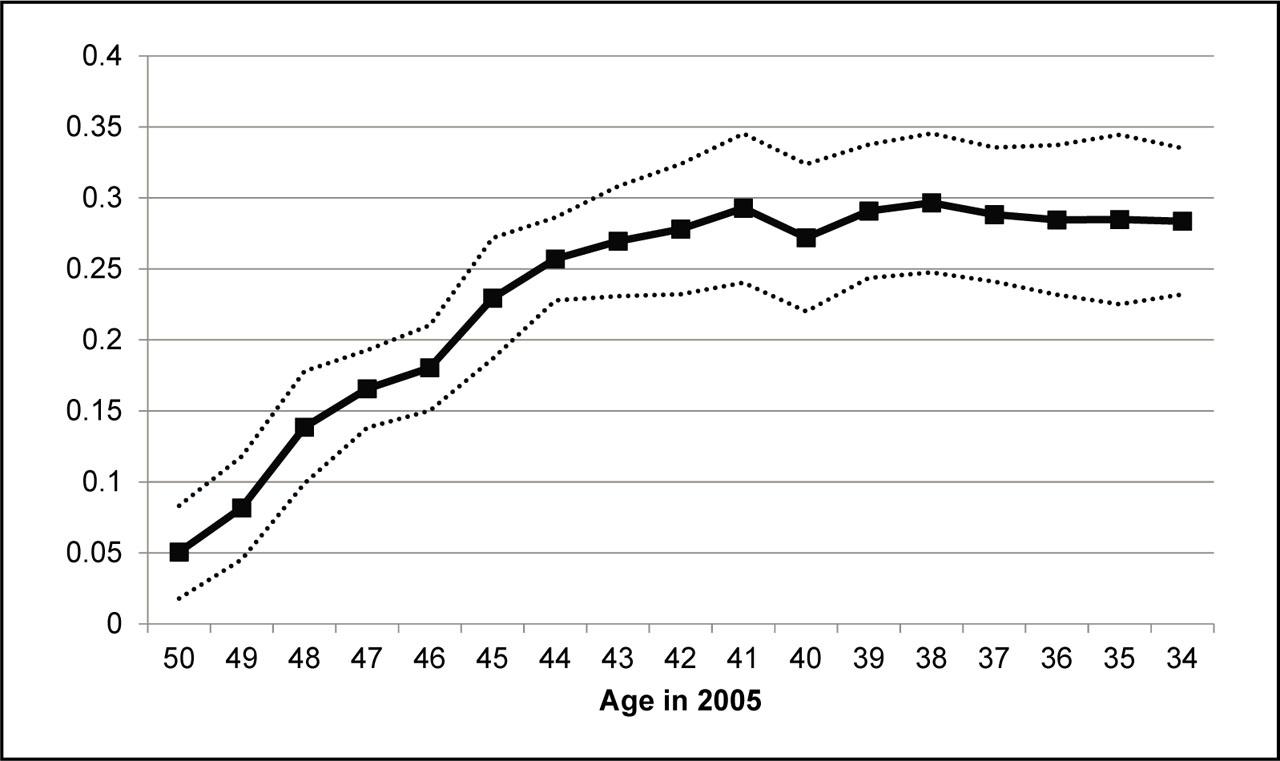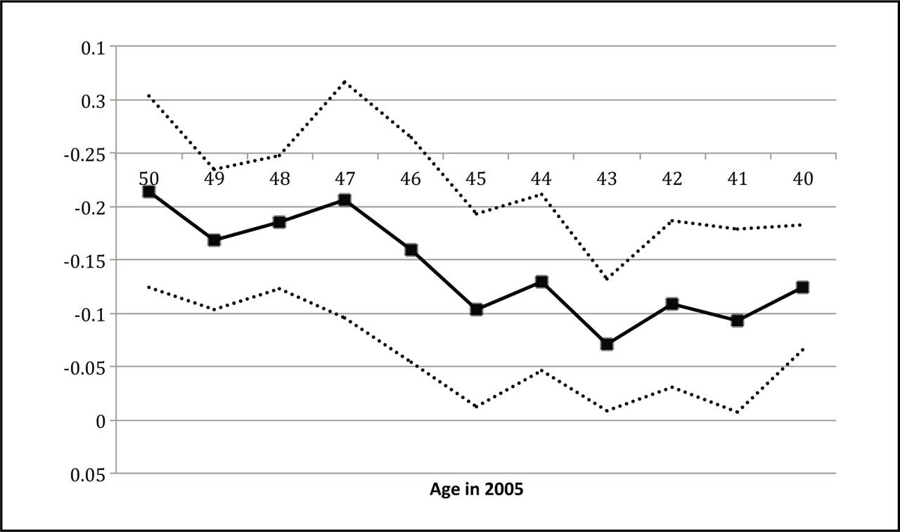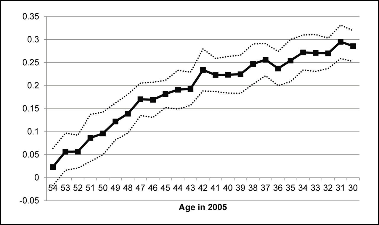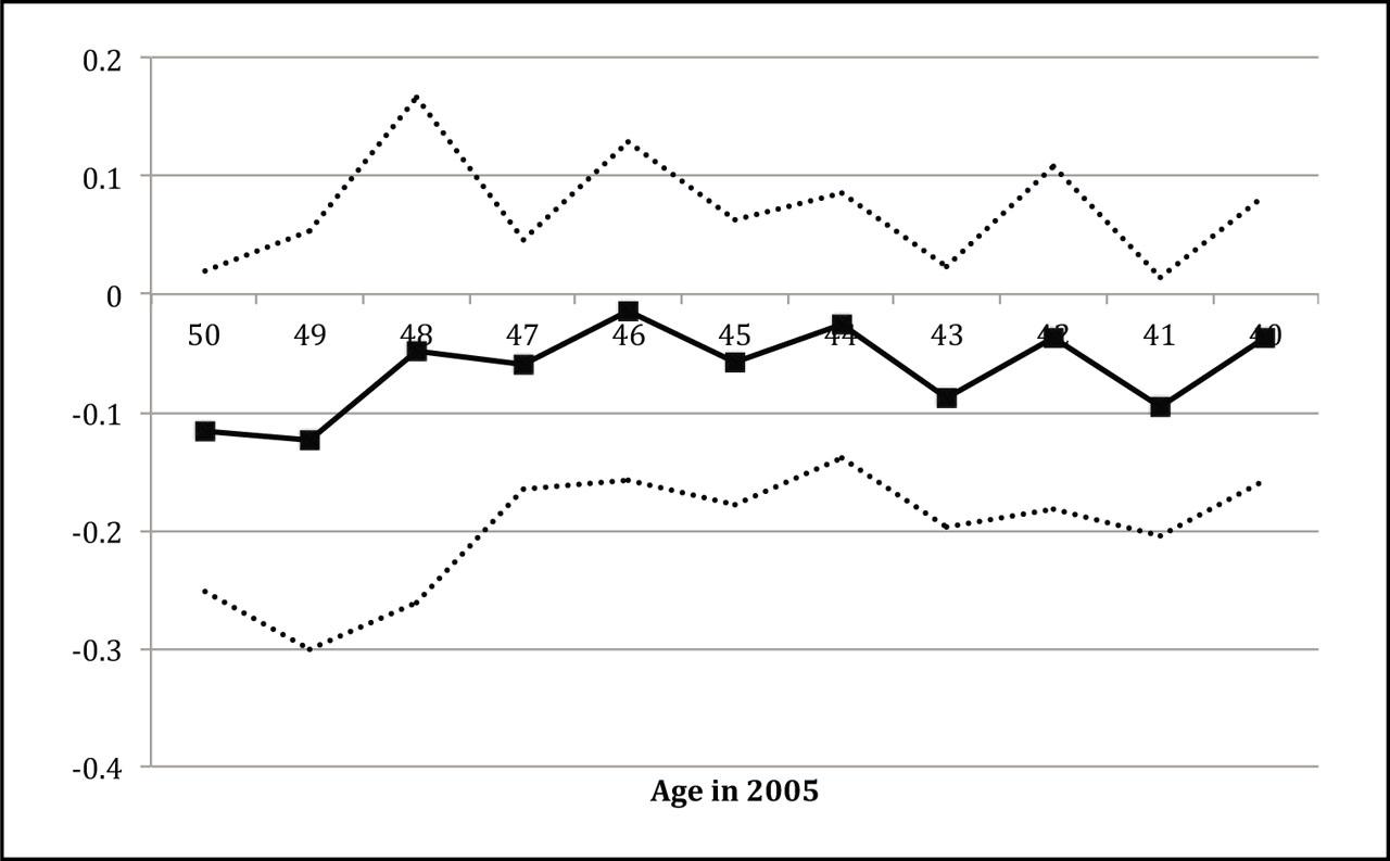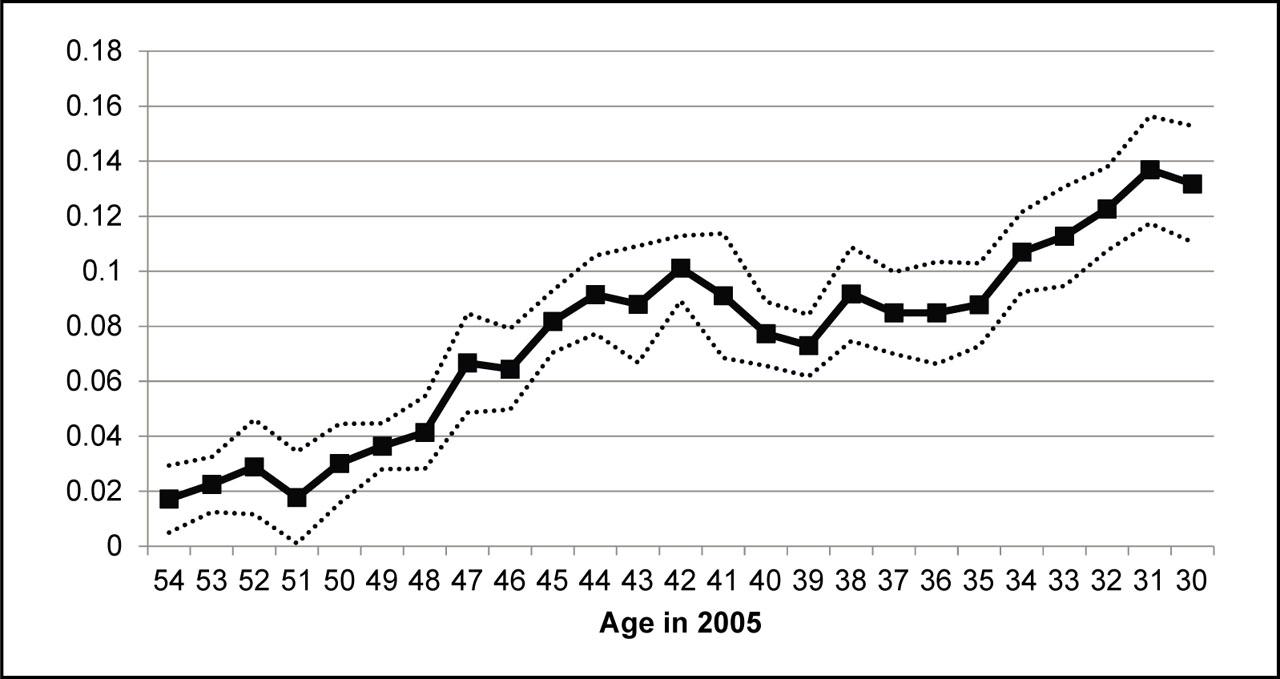 Figure 4 plots the estimated βc's for the whole sample. The solid line shows the probability of completing post-secondary education, while the dashed lines indicate the 95-percent confidence interval. The substantial drop in post-secondary education between ages 40 and 45 is not typically observed in developing countries and may be hard to justify in the absence of a big negative shock affecting post-secondary educational outcomes for those cohorts. Figures 5 and 6 plot the estimated coefficients for men and women, respectively. Although the trends for completing post-secondary education look similar in both figures, the effect of the turmoil is much more pronounced for men than that for women. Based on these results, individuals of age 40–45 are marked as “exposed individuals” throughout the analysis. Those individuals were born between years 1960–1965, and were about 13 to 18 years old as of 1978. (11)