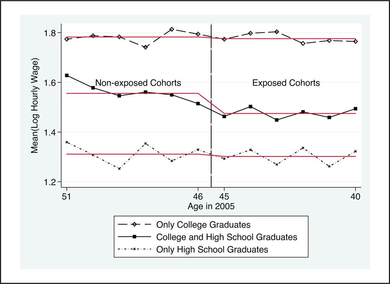 The average potential experience of male wage earners for the age group 34–51 is 26 years. In all regressions, we standardize log hourly wages at 26 years of potential experience because our treatment and comparison groups have different experience levels and explicitly controlling for experience in our regressions may create a collinearity problem as we define the treatment and control groups based on age (or birth cohort). We estimate a log hourly wage equation separately for each education category defined in the survey data for this group. These categories are no degree, primary school (five-year), middle school (eight-year), high school, and post-secondary degrees. Following Altonji et al. (2012), we include potential experience as a quartic function and, from these regressions, we compute the predicted log hourly wage for a common experience of 26 years and add the residual.
