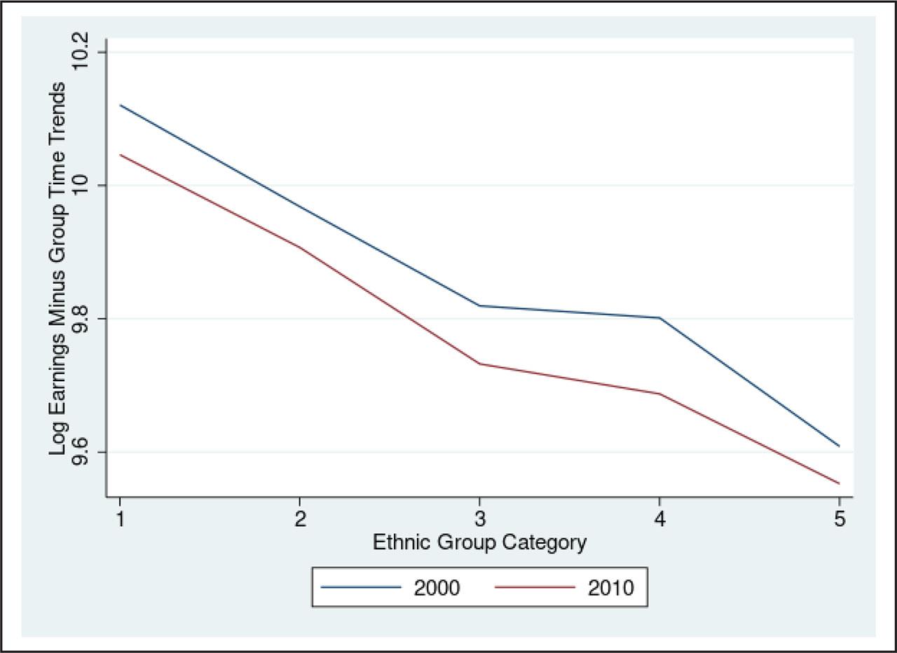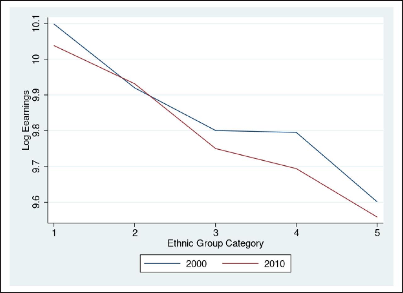 | 2000, 60 groups (age 20–30, arrived after age 17) | −0.361* (0.187) | −0.308 (1.667) | 1.300* (0.723) | −0.162** (0.067) | 132.097 (4536.585) | −8.553 (293.454) |