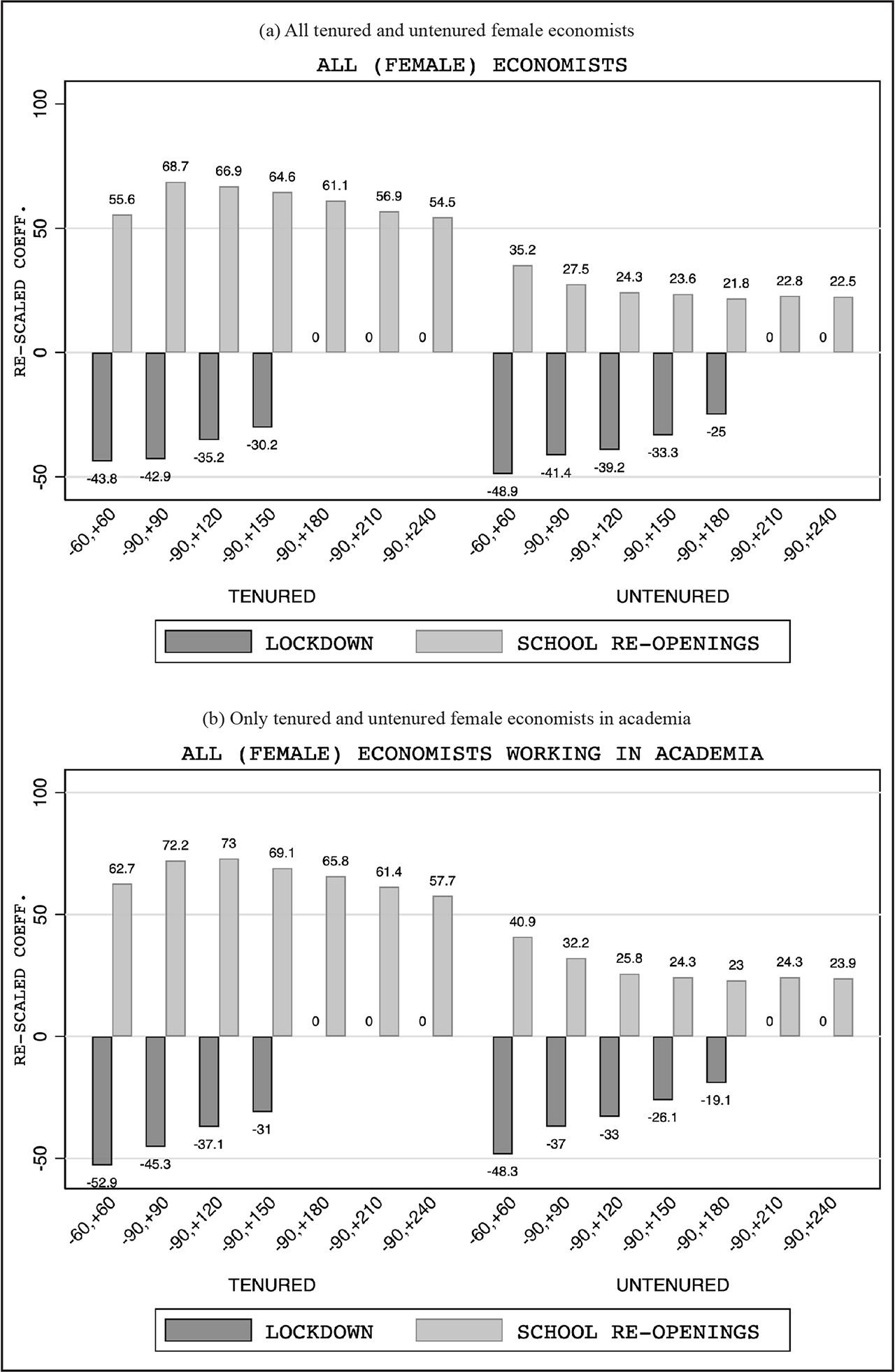 Falsification test: anticipated lockdown and school re-openings on gender production by tenure in 2019, only academics