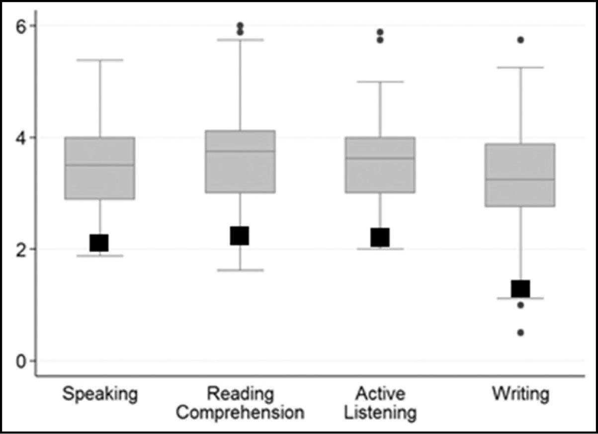 Expert judgments for skills needed among maids and housekeeping cleaners (black squares) relative to all jobs (box plots).