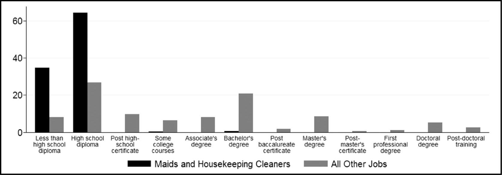 Distribution of educational requirements for maids and housekeeping cleaners compared to all other jobs in the U.S. labor market.