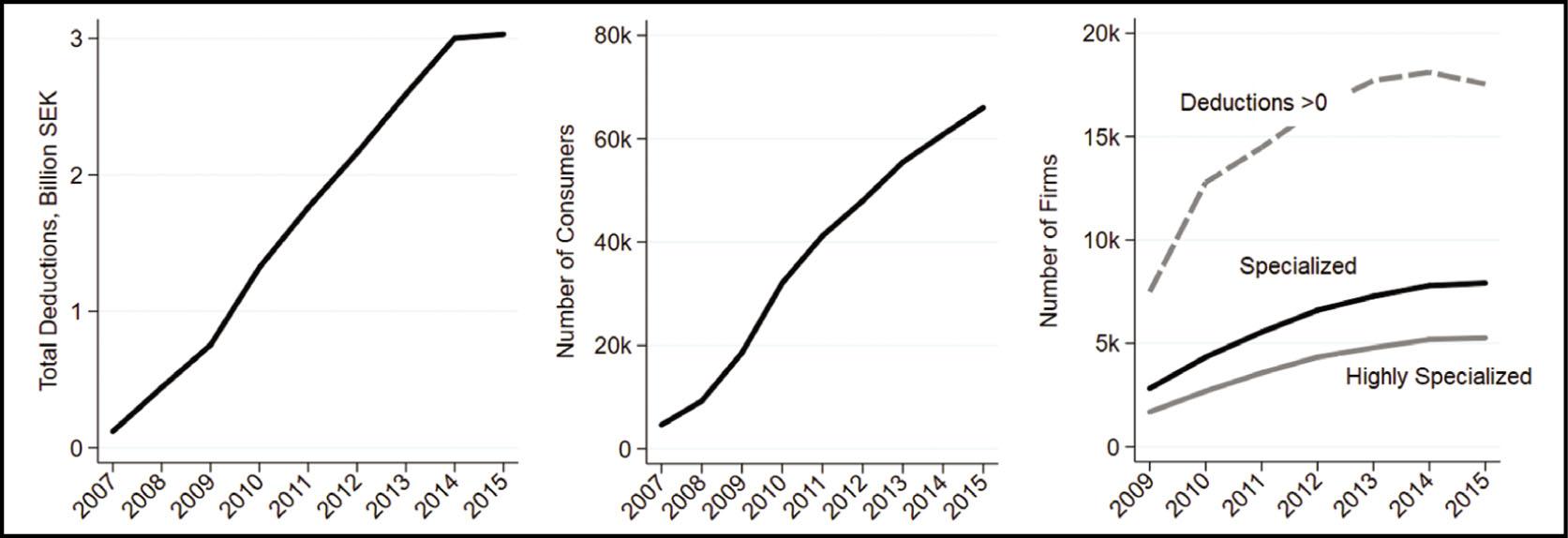 Notes: The figure shows time trends in the total tax-deductions (left), the number of consumers with non-zero deductions (center) and the number of firms in three categories of specialization (as defined in Section 4).
