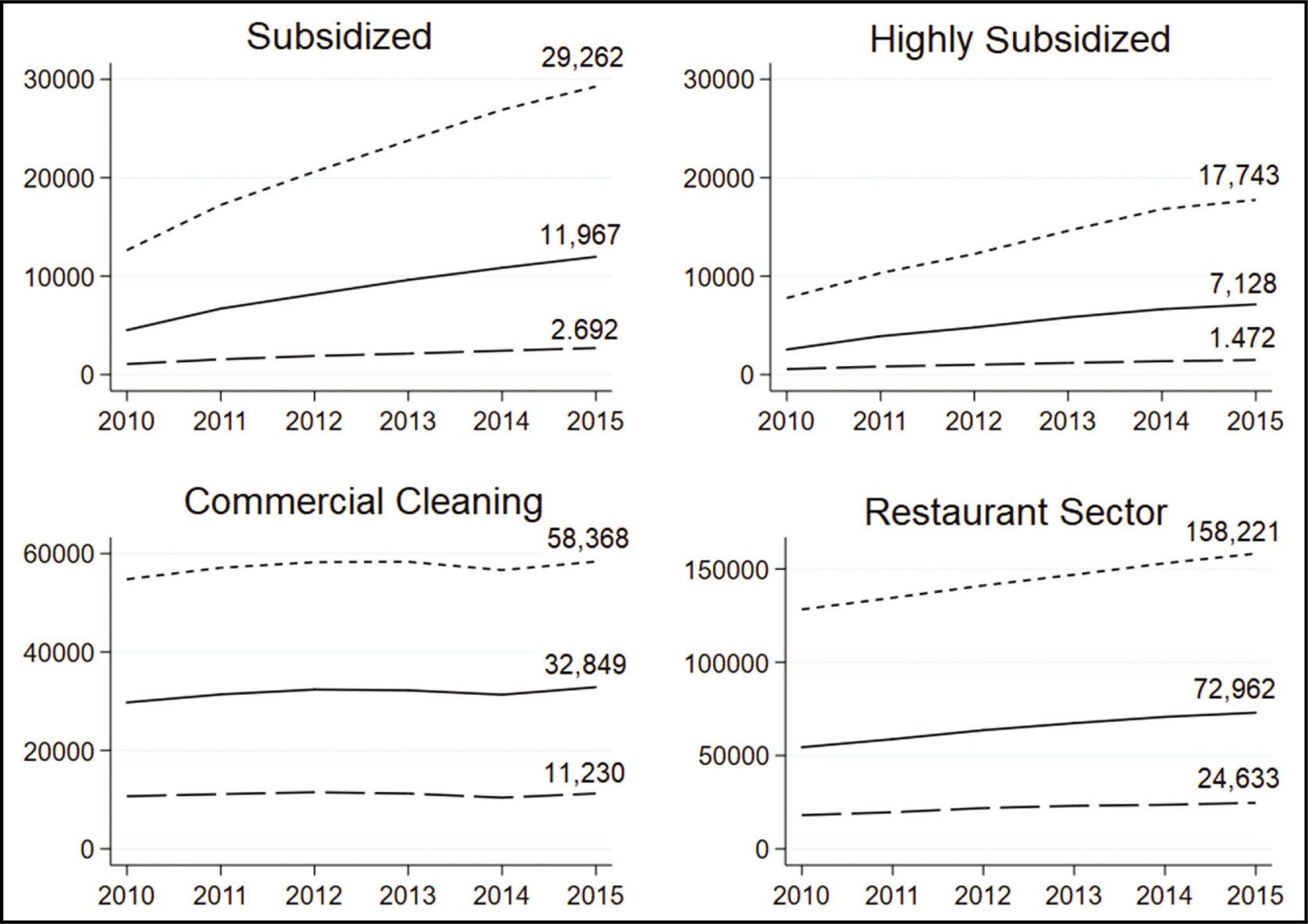 Employment in the subsidized sector grew consistently over the 2010–2015 period. In 2015, the subsidized firms together employed 11,967 and the highly subsidized firms employed 7,128 people according to my main definition. Splitting these groups according to whether people have income from wages or business income shows a relatively high rate of self-employment in the subsidized sector compared to the comparison sectors (Figures W4 and W5 in the Web Appendix). In subsidized and highly subsidized firms, 29% and 32% of employees are self-employed, respectively, compared to 18% in the restaurant sector and 9% in the commercial cleaning sector.