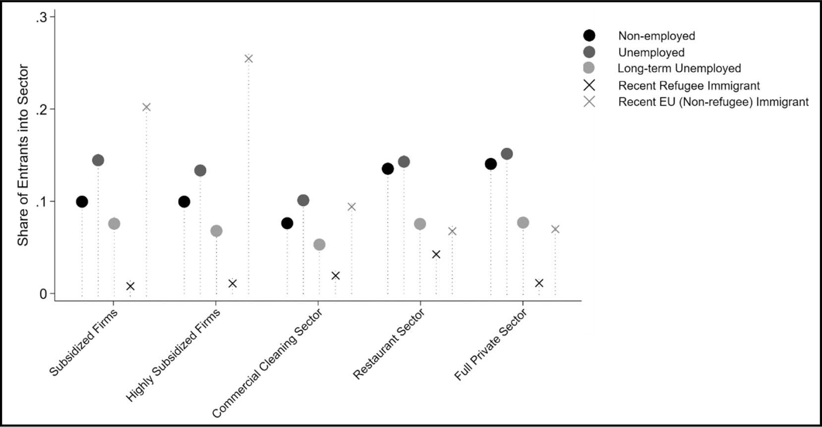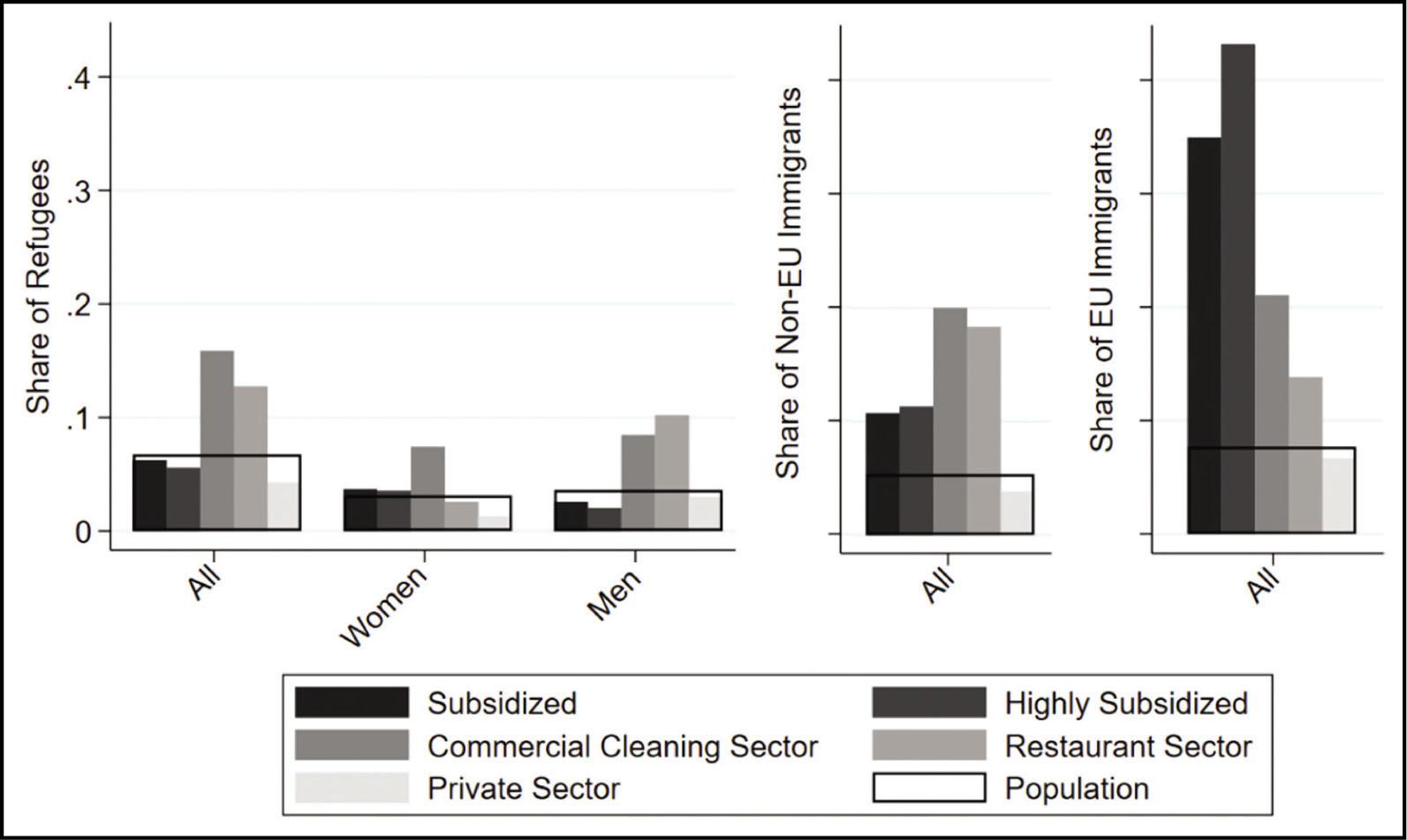 Figure W6 in the Web Appendix replicates Figure 5 for the year 2015 and shows the results separately for wage earners and small business owners. This description shows that the proportion of EU immigrants is even higher among small business owners than employees in the subsidized sector. They make up a third of all small business owners in the subsidized sector, and nearly one half in the highly subsidized sector. In contrast, the share of refugee women is smaller among business owners than among employees.