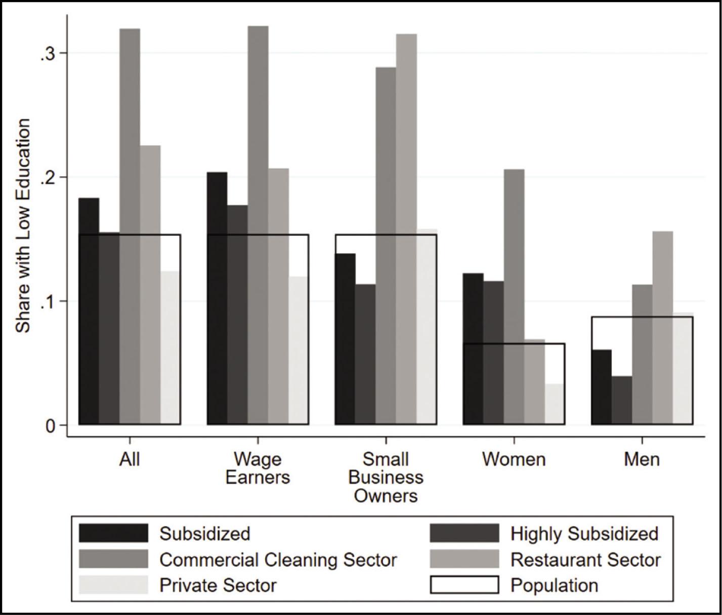 Figure 6 shows the shares of people with low education across sectors. Starting with total employment, the subsidized sector employs a larger share of people from this group than the private sector as a whole, but a smaller share than the two comparison industries. When we break the sample down into wage earners and small business owners, we can see that the subsidized sector is relatively successful at employing low-educated people as wage earners, but less so for small business owners. For wage earners, subsidized firms employ a higher share of low-educated people than the full private sector, a similar share as the restaurant industry, and a smaller share than the commercial cleaning sector. For small business owners, the share is lower than in all three comparison sectors. People with low education operate roughly 15% of small businesses in the subsidized sector, 10% of those in the highly subsidized sector, but nearly 30% in the comparison sectors. This is remarkable given the relatively low capital requirements for starting a business in the domestic service sector.