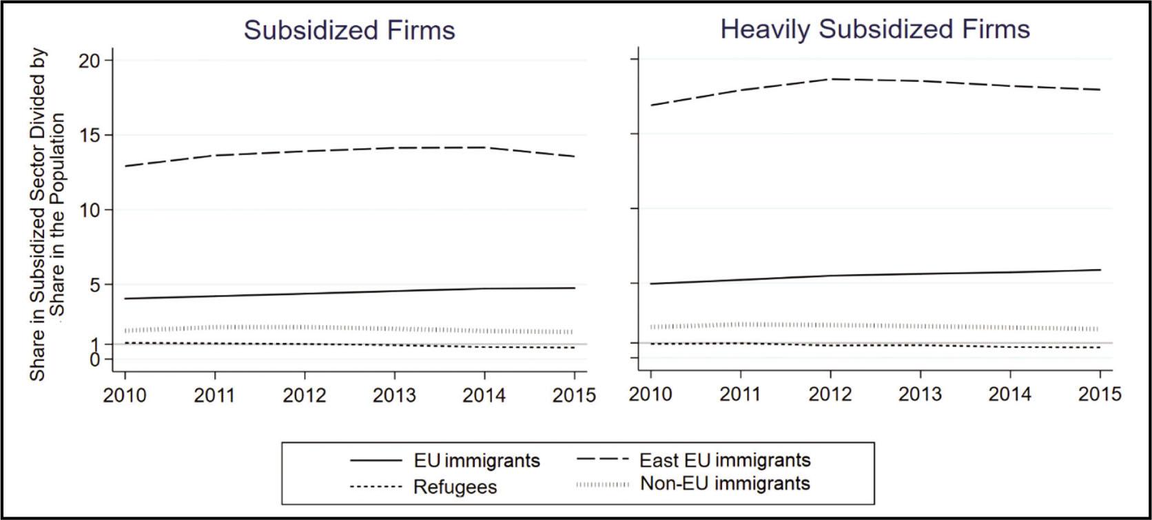 Figure 8 plots time trends in the over- or under-representation of immigrant groups in the subsidized sector over time. The Y-axis shows the immigrant group's share in the subsidized sector divided by its share of the working-age population. A value of 1 on this scale indicates that the group has the same size in both the subsidized sector and the population. The dashed line represents Eastern European immigrants, who are strikingly over-represented by 12–15 times in the subsidized sector, and 18 times in heavily subsidized firms. Pooling all EU immigrants, the over-representation is smaller at 5 times the population share. Neither of these rates of over-representation has any positive or negative time trends. For refugee immigrants, the ratio remains less than 1 for the whole period.