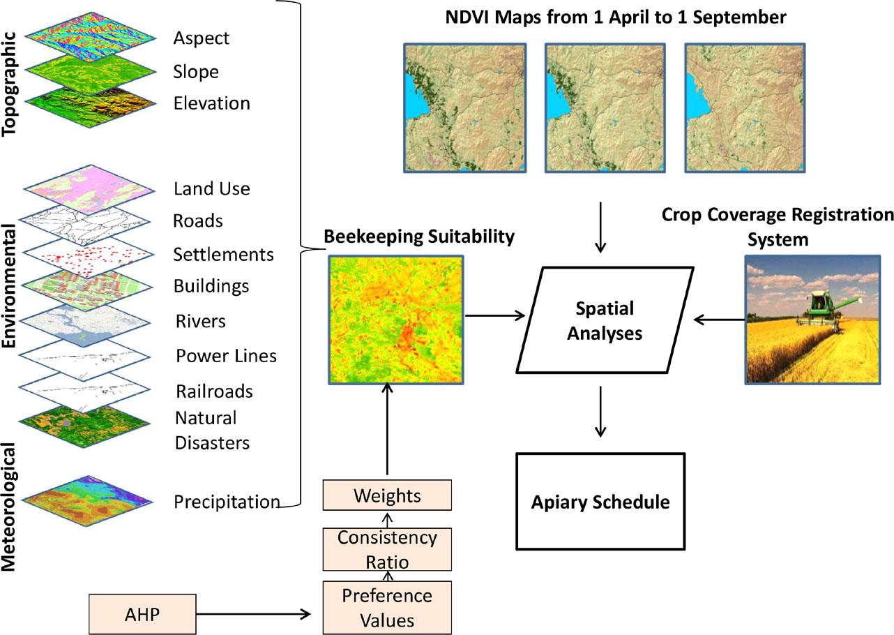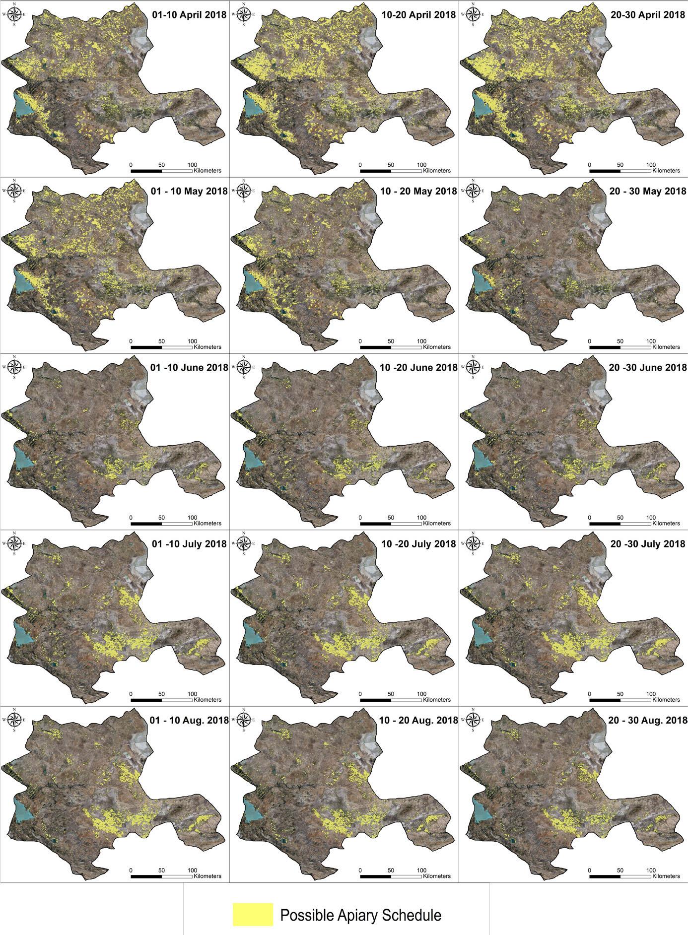 Aspect, slope, elevation, flora, water resources, roads, settlements, precipitation, buildings, railroads, power lines and natural disaster areas have been included in previous studies as criteria to generate beekeeping suitability maps. The resultant maps were then overlapped with NDVI and CCRS integration to generate apiary schedules. The novelty of this study is the integration of suitable apiary locations, NDVI imagery and CCRS records instead of using only NDVI imagery as in recent studies. The main aim of this study is to generate an apiary schedule to be able to determine honey production dates within the beekeeping suitability concept and to detect the seasons of the study area in both natural plant areas and agricultural lands. The resultant maps guide both beekeepers and authorized institutions in monitoring and managing beekeeping activities and establishing a conceptual model for an apiary schedule and migration route determination.