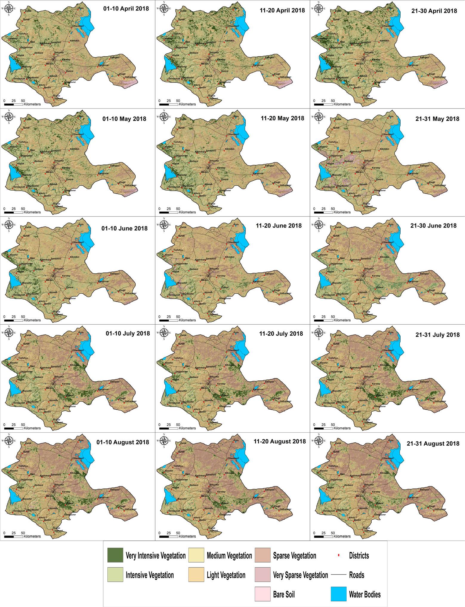 The MODIS images were retrieved over a 10-day period and the NDVI data (Fig. 3) were generated by using ArcGIS 10.5 software.