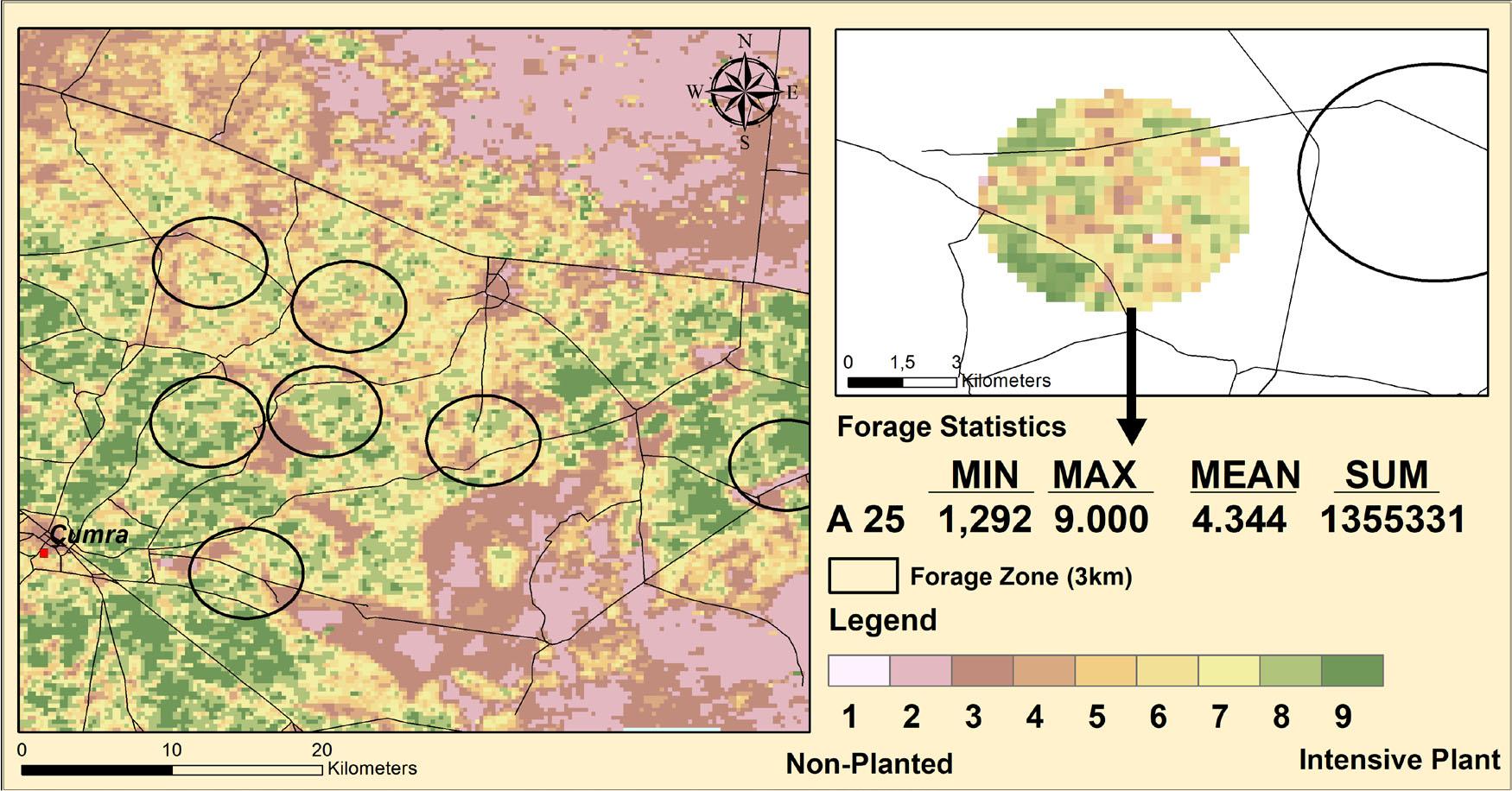 The apiary schedule is verified with zonal statistics by determining the vegetation index which honey bees each within a three-kilometre buffer zone. Although the forage area gives valuable information about the suitability and reliability of the apiary schedule, it is also the most appropriate data to prove the schedule's accuracy. Thus, three-kilometre buffer zones were determined for each of the 176 apiary locations, and zonal statistics were calculated to determine the total vegetation availability within all honey season dates for each buffer zone. Every pixel of the resultant NDVI maps was counted and summarized with a mean value to compare each buffer zone to another. The results for three apiary schedule zones were evaluated by comparing forage zone statistics and date intervals retrieved from the field studies. The mean values were converted to the 1-to-9 scale in which 9 represented the most intensive planted forage zones and 1 the non-planted forage zones (Fig. 5).