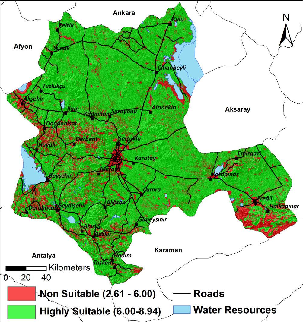 The results indicated that 10.8% and 42.5% of the study areas were determined as highly suitable and suitable, respectively, for beekeeping activities. A large percentage of the highly suitable areas included agricultural lands. Approximately 60% of the suitability specified was accounted for by the high weight values of the flora, distance to water resources and aspect. The beekeeping suitability map of the study area is shown in Fig. 6.