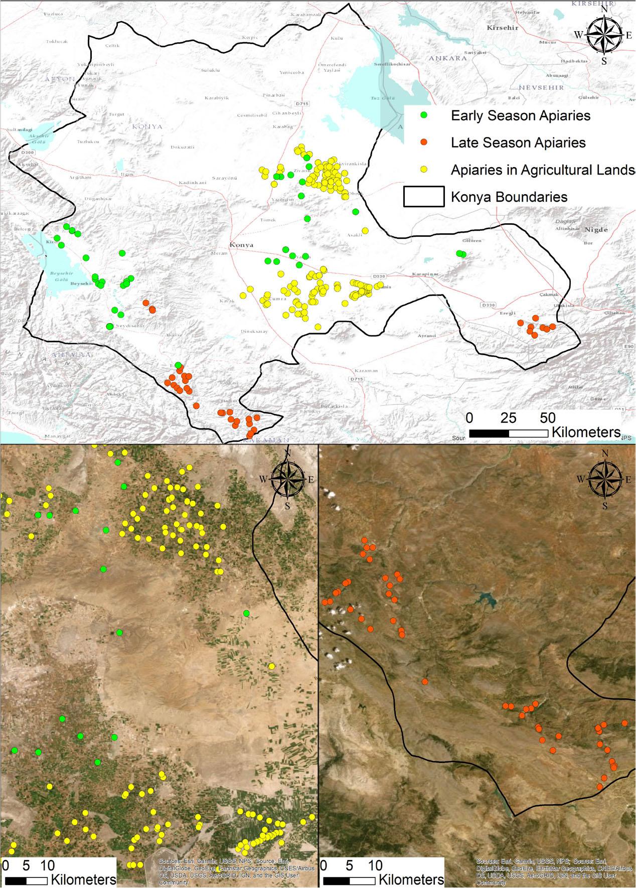 As seen in Fig. 8, some early season apiaries were detected inside agricultural lands, and upon examination they were revealed to be located in mountainous and natural floral areas surrounded by agricultural lands. The overlapping of these apiaries with the apiary schedule was generated between 10th April and 10th May. Late season apiaries were located in mountanious lands where climatic and topographic conditions were quite harsh.