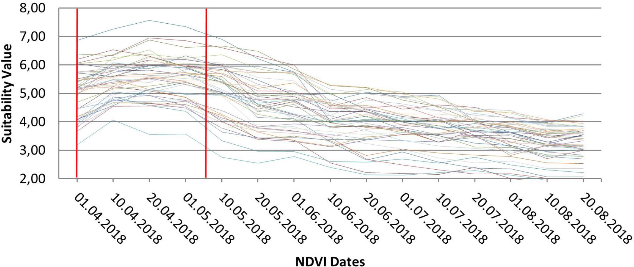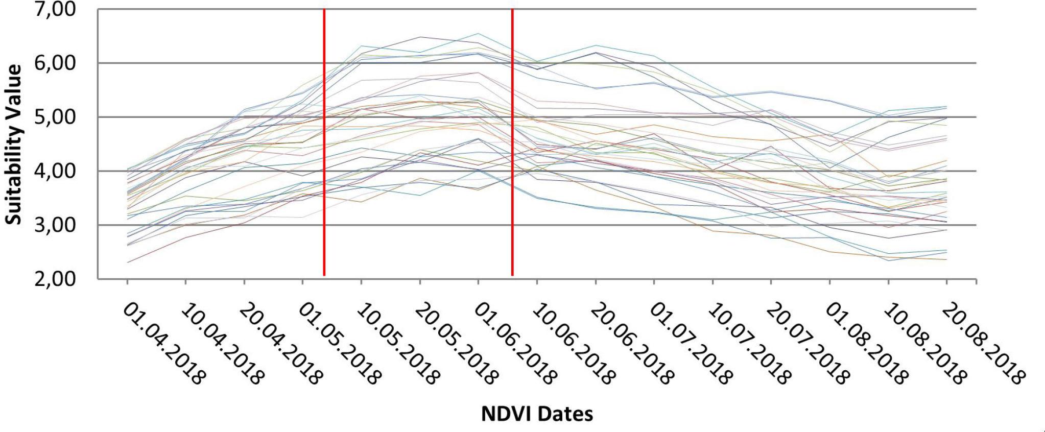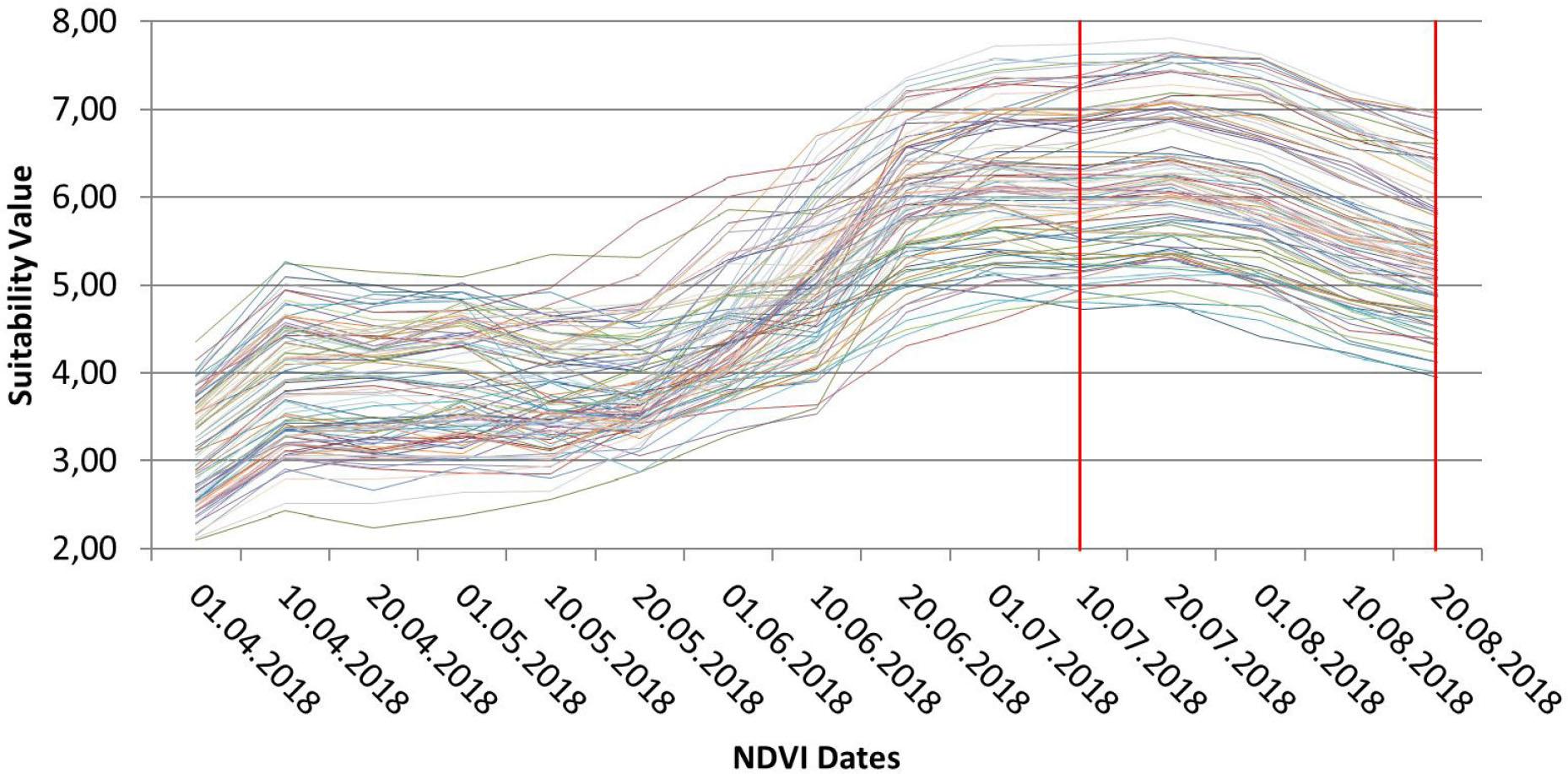 In total, ninety-six apiaries were located in agricultural zones within two main clusters, fifty-two of them were located in the Çumra-Karapınar districts and thirty-eight in the Altınekin district. These regions have similar the topography and climatic conditions and the same agricultural crops. Plant density varies from minimum 2.1 to maximum 7.82 within the apiary schedule. The graphics revealed that the maximum plant density started on 1st July and started to decrease on 20th August. The field study results show that average start and end dates were determined as 8th July and 24th August. The plant density and apiary schedules are given in Fig. 11. The red lines represent the start and end times of the season which were retrieved from the field studies.