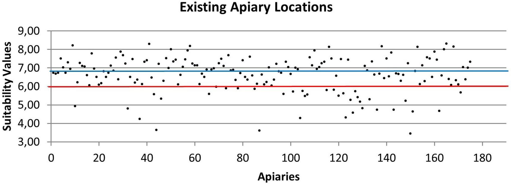 The apiary locations and suitability values were examined to verify the suitability map, and the results showed that fourteen apiary locations intersected with low suitability and forty-two apiary locations intersected with highly suitable locations. Thus, 144 of the existing beekeeping areas intersected with suitability values higher than 6 and provided 82% intersection with existing apiary locations. The graphics of suitability values according to the existing apiary locations are given in Fig. 12., and the optimal production start suitability threshold value (6) for apiaries is emphasized with a red line. The blue line indicates the average suitability of all 176 existing apiary suitability values. The accuracy and intersection rates show that the suitability map can be used for both apiary schedules and locating apiaries.