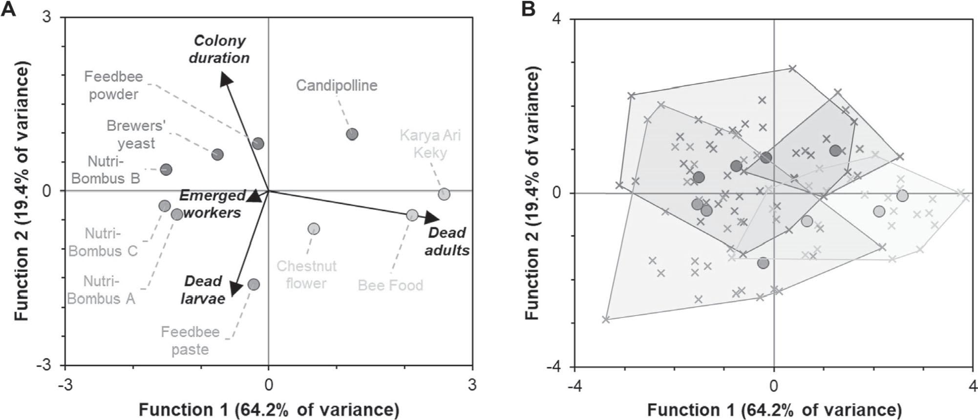 Projection on the first two discriminant functions of different pollen substitutes for the feeding of artificially reared bumble bees. Circles represent treatment centroids of each pollen substitute. (A) Correlation biplot based on discriminant analysis (DA). Differently discriminated centroids of pollen substitutes are in different DA quadrants. Explanatory variables are shown as arrows magnified three times for graphical purposes. (B) Canonical scores of individual colonies (crosses) on first two discriminant functions. Different groups are shown with different grayscale crosses and enclosed by an envelope.