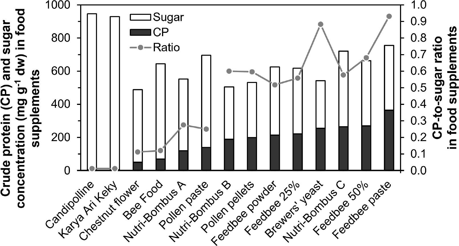 The fourteen different diets were clearly distinguished into three clusters by their mean CP-to-sugar ratios (Fig. 2). Candipolline and Karya Ari Keky belonged to the cluster with the smallest mean CP-to-sugar ratio (0.005) while Brewer's yeast, Feedbee 25% and 50%, Feedbee paste and powder, Nutri-Bombus B and C, and Pollen pellets to the cluster with the highest mean CP-to-sugar ratio (0.7). Finally, Bee Food, Chestnut flour, Nutri-Bombus A and Pollen paste belonged to the cluster with an intermediate mean CP-to-sugar ratio (0.2) (Fig. 2).