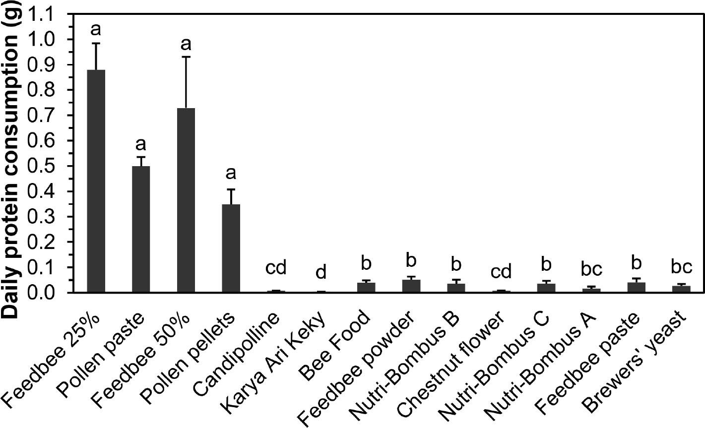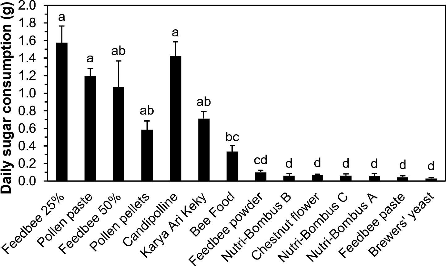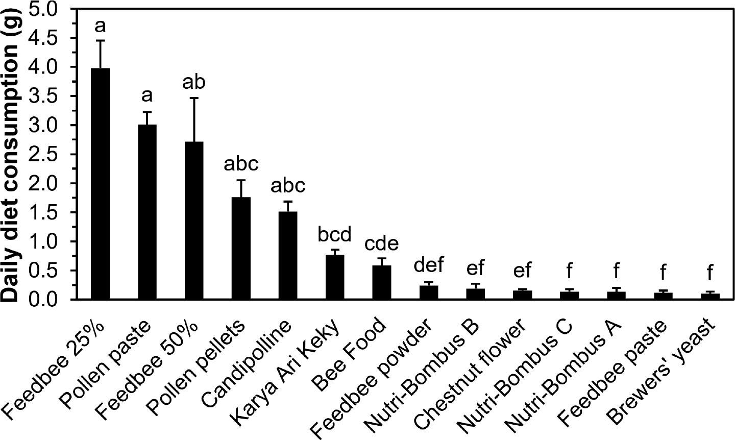 The mean total daily consumption significantly (p ≤ 0.001) differed between the test diets (Fig. 3) and with a very large effect size (ω2 = 0.71). The most consumed diet was Feedbee 25% although not significantly more than Feedbee 50%, the two diets containing only pollen and Candipolline. The other test diets were significantly lower from Feedbee 25% and Pollen paste and had a daily consumption lower than one gram and from 2 to 38 folds lower than the Feedbee 25 and 50%, Pollen and Candipolline diets (Fig. 3). However, Karya Ari Keky was not significantly different from Feedbee 50%, Pollen Pellets and Candipolline, and Bee Food was not significantly different from Pollen Pellets and Candipolline (Fig. 3).