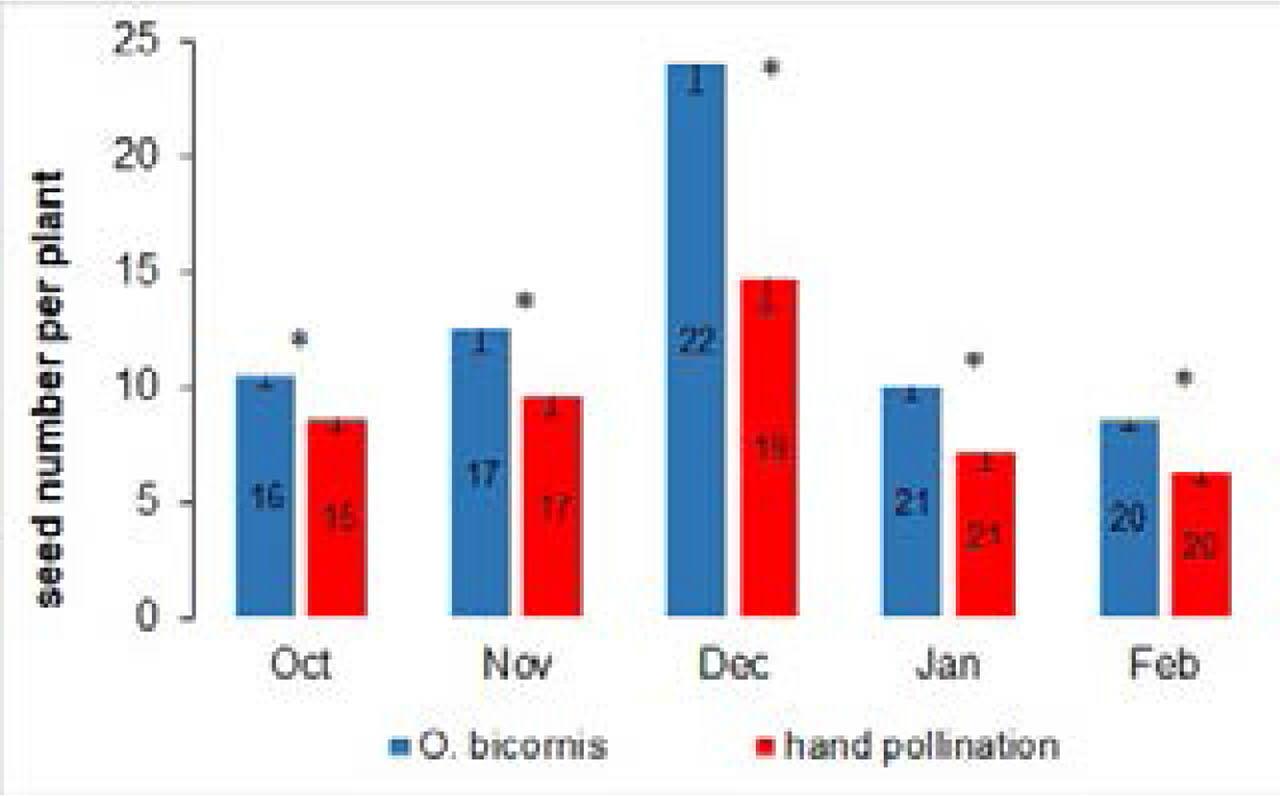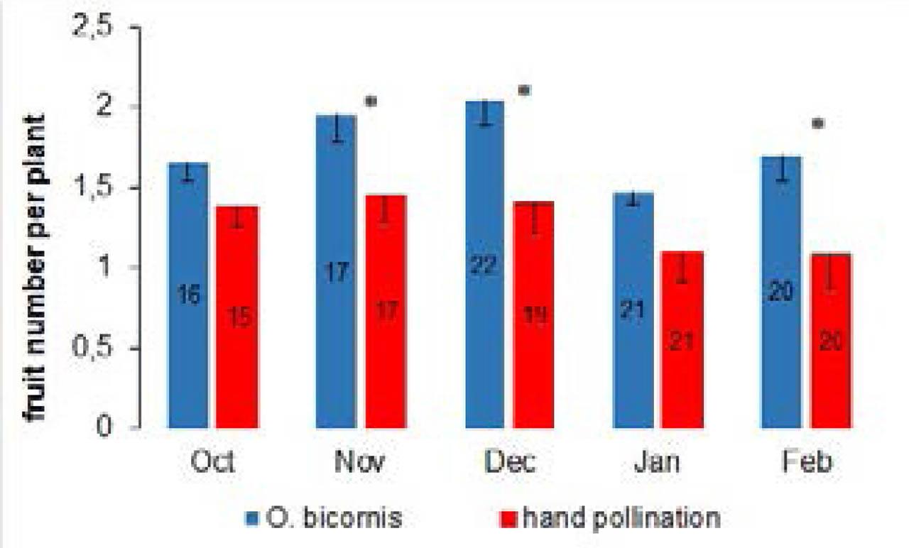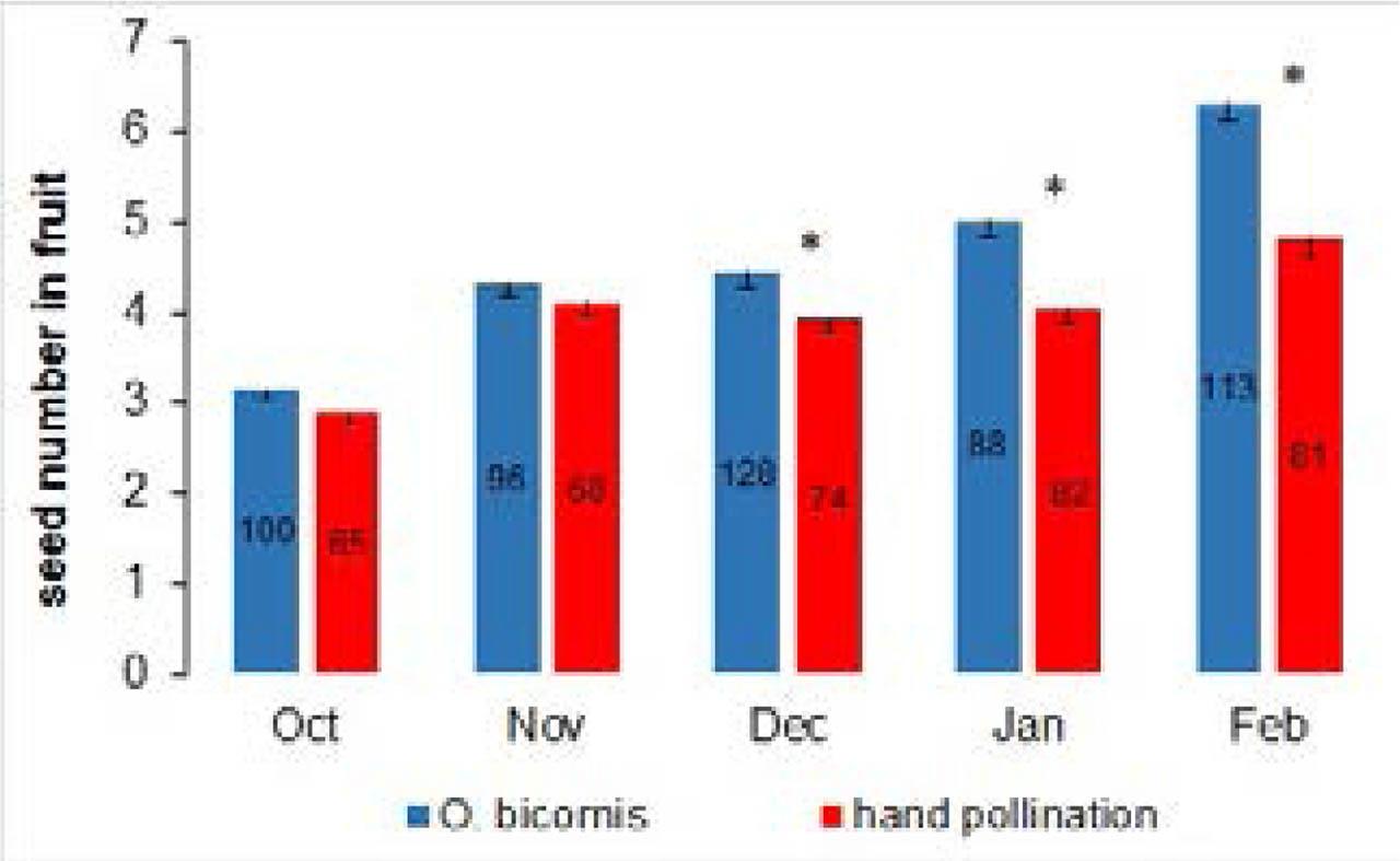 In February, the efficiency of pollination by Osmia bees expressed by the number of seeds per capsule was 28.1% higher than that of hand pollination (based on the untransformed data). In each research month, statistically significantly more seeds were produced by plants pollinated by O. bicornis (p<0.05; Fig. 5). Bee pollination was particularly efficient in December when seed yield per plant pollinated by O. bicornis was as much as 56.1% higher than from a hand-pollinated plant; in other months, these differences ranged from 39.6% to 48.4% (untransformed data).