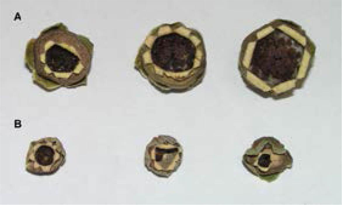 Fruits of Persian cyclamen formed after O. bicornis pollination (A) and pollination without bees (B).