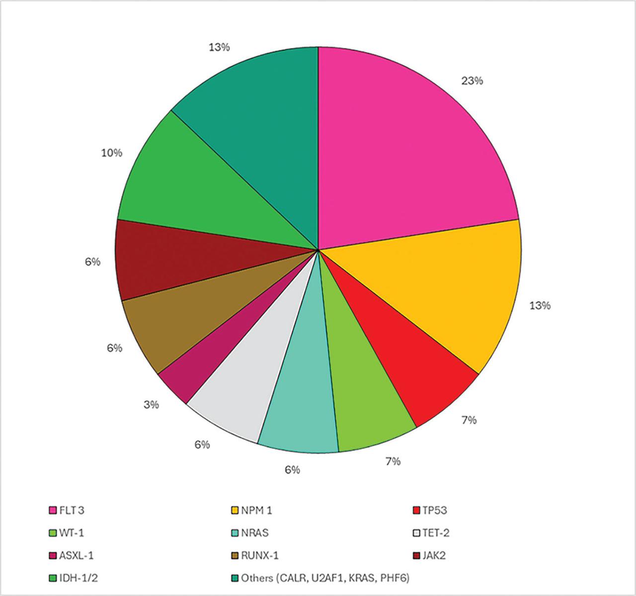 20 (34%) of the patients had AML with cytogenetic abnormalities. Of these, a majority – 5 (9%) had complex karyotypic abnormalities including 3 or more chromosomal aberrations. Table 2 provides a detailed overview of the chromosomal abnormalities encountered. 20 (34.5%) patients developed AML with molecular abnormalities, with FLT-3 mutations comprising the majority of cases. Table 3 describes the various molecular mutations encountered in our cohort. Figure 1 describes the proportion of patients presenting with a particular molecular abnormality.