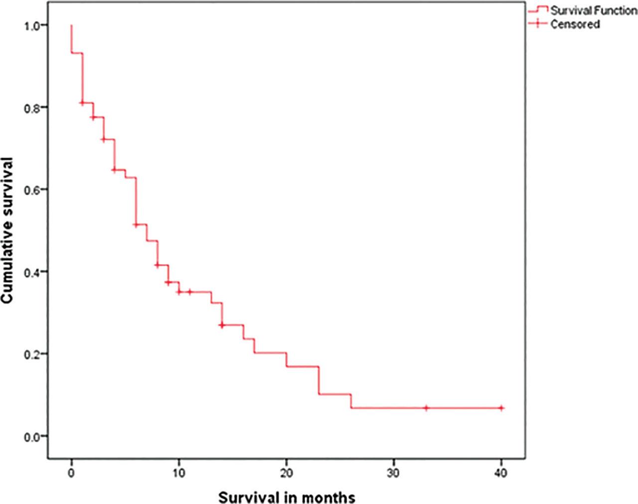 Kaplan Meier Curve for overall survival among patients with Acute Myeloid Leukemia treated with Venetoclax and Azacitidine.