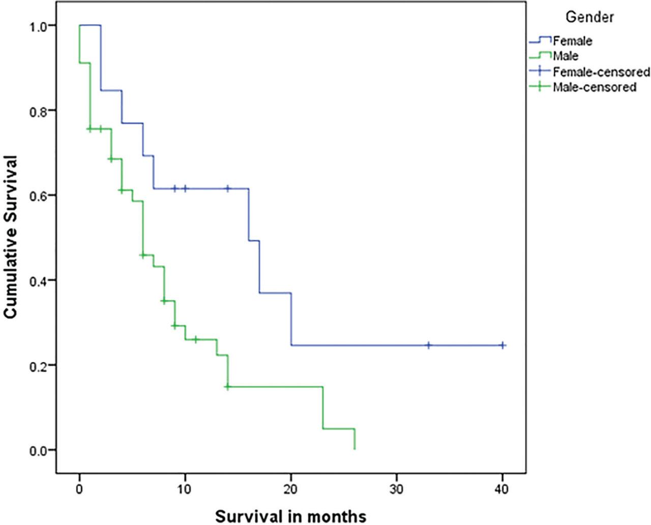 The median OS of patients in our cohort was 7.0 months with a 95% CI of [5.1 – 8.9]. Figures 3 and 4 show the survival stratified by comorbid status and gender respectively. The log-rank test for difference between median survival among patients with and without comorbid conditions was not significant with a p value of 0.586. The median overall survival among males was 6 months [4 – 8], while among females was 16 months [4 – 28], with a p value of 0.021.