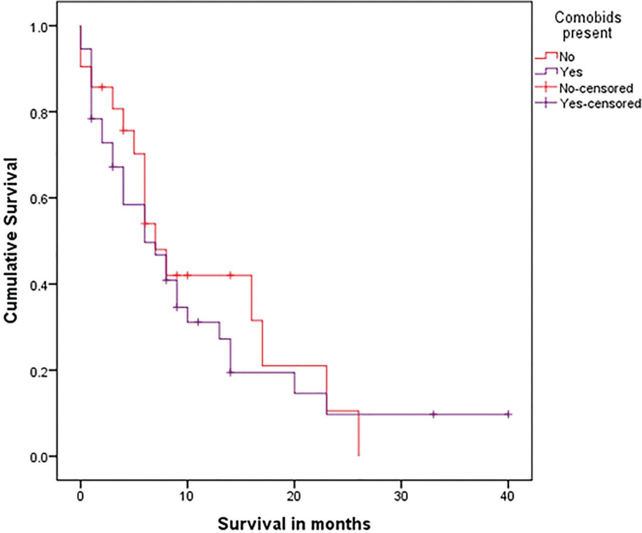 The data was analysed using Statistical Package for the Social Sciences version 21 (SPSS 21). Categorical variables were described using frequencies and percentages whereas continuous variables were summarized using either means and standard deviations or medians and interquartile ranges. We conducted a survival analysis on our cohort with the outcome event as death. The date of diagnosis was used as the starting time. Kaplan-Meier survival curves were generated for overall survival (OS), survival by gender, and survival by comorbid status. Additionally, we used the log-rank test to compare median overall survival times for both the genders and the presence of comorbid conditions. Patients lost to follow-up, or alive at the end of the observation period were right censored. The multivariable Cox proportional hazards regression model was used to adjust the p values and hazards for key factors. All results have been quoted with their 95 percent confidence intervals. A p value less than 0.05 was considered statistically significant for all tests.