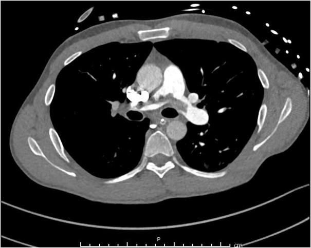 CT pulmonary angiogram axial image demonstrating saddle pulmonary embolism