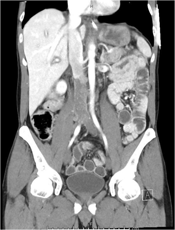 CT abdomen and pelvis coronal image demonstrating extensive iliocaval thrombosis