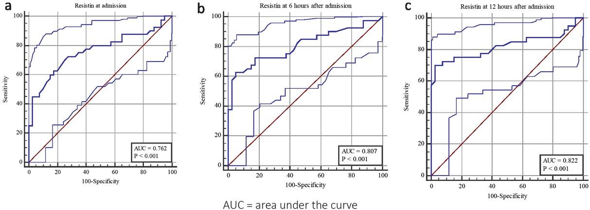 The AUC values for resistin for the first 3 measurements, when comparing Group A with Group B, shows that the best AUC value is obtained for the first 12 hours (Figure 1).