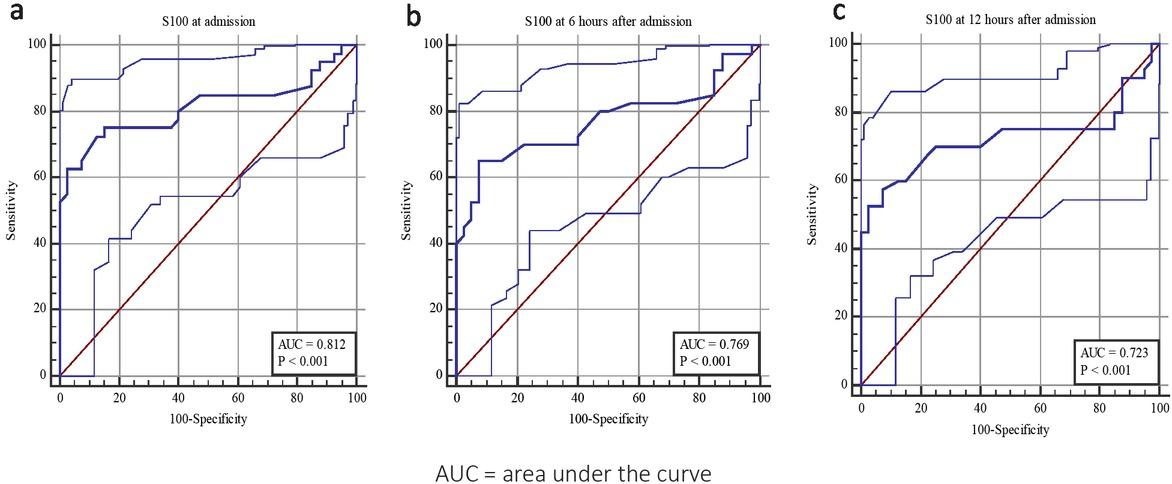For S100B, the AUC values for the first 3 determinations for Group A with Group B are shown in Figure 2.