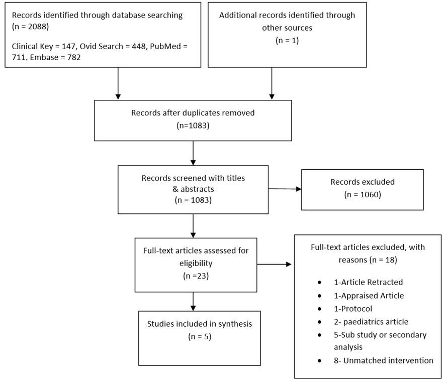A total of 2088 potentially relevant articles were identified via searching Embase (N=782), PubMed (N=711), Ovid Search (N=448), Clinical Key (N=147). Additional records were included through other sources (n=1). After removing duplicates, 1083 articles were screened based on their titles and abstracts. Twenty-three full-text articles were reviewed based on the inclusion and exclusion criteria of the review. Of these, eighteen articles were excluded as they did not meet the eligibility criteria. One retracted trial was identified, one appraised article, two paediatric trials, one ongoing trial, five were sub-study or secondary analysis of a major clinical trial (EPaNIC study), and eight studies had an unmatched intervention. Five RCTs were finally identified for inclusion in this systematic review (Figure 1).