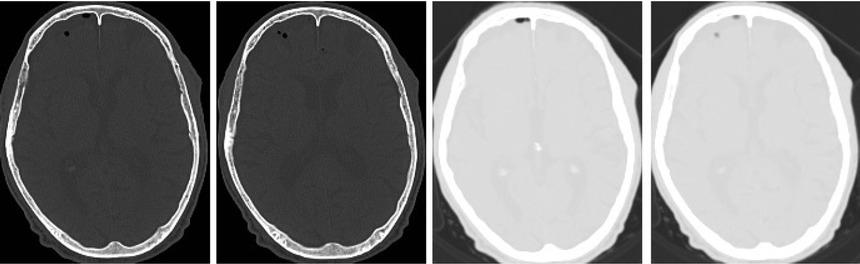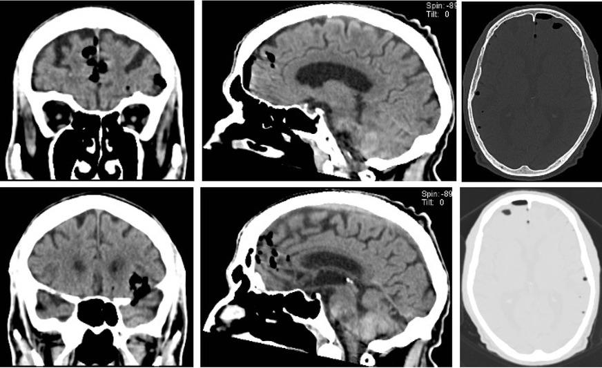 A second head CT scan was performed on the second postoperative day, five hours after the end of the hyperbaric oxygen therapy session, showed a significant reduction in the air bubble volume (Figure 2), with only minor residual air foci in the right anterior subdural space, in the left frontal and temporal cortical grooves. No further hyperbaric oxygen therapy was needed.