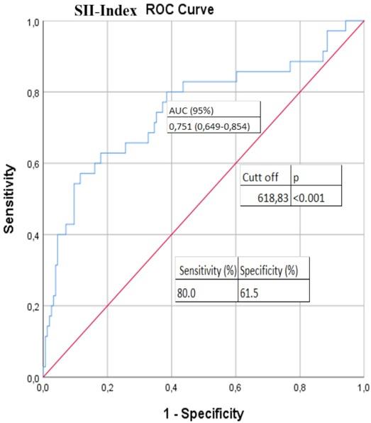 ROC curve analysis to test diagnostic ability of SII index for mortality. SII index: systemic immune-inflammation index, ROC: receiver operating characteristic curve; AUC: area under the curve.