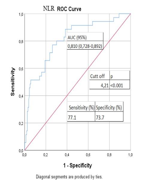 | NLR | 3,31 | 2,73 | 9,27 | <4,21 | 123 | 64.4 | 6.5% | 1038,5 | <0,001 |