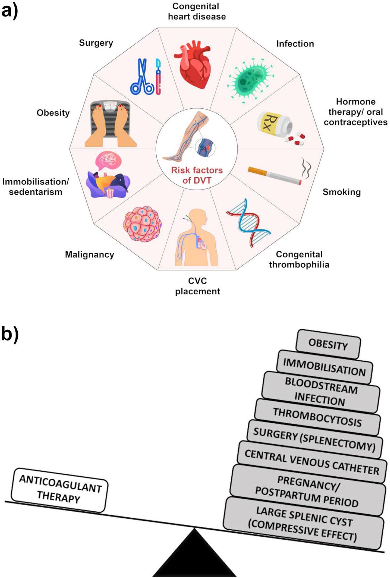 a) Major risk factors of deep vein thrombosis (DVT). b) Disbalance between the anticoagulant (low-molecular-weight heparin) and procoagulant factors in the pediatric patient. Image created in GIMP 2.10.30 software (The GIMP Development Team, https://www.gimp.org).