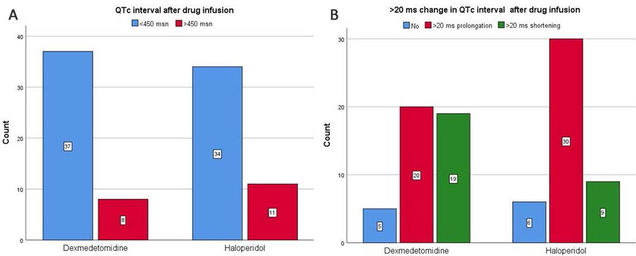 The QTc interval was above 450 ms after drug infusions in 17.8% (8) of patients receiving dexmedetomidine treatment and 24.4% (11 patients) of patients receiving haloperidol treatment, with no significant difference between the groups (p=0.6). The proportion of patients with a >20 ms increase in QTc interval after drug infusion was 44.4% (20 patients) in patients receiving dexmedetomidine treatment, 66.7% (30 patients) in patients receiving haloperidol treatment, with a significant difference between the groups (p=0.06). The proportion of patients with a >20 ms shortening in QTc interval after drug infusion was 43.2% (19 patients) in patients receiving dexmedetomidine treatment, 20.0% (9 patients) in patients receiving haloperidol treatment, with a significant difference between the groups (p=0.05) (Figure 3).