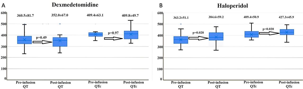 In previous studies, dexmedetomidine and haloperidol were not compared in terms of their ECG properties. Initial concerns regarding the potential of haloperidol to prolong the QT interval emerged from several case reports and small case series documenting occurrences of Torsades de Pointes (TdP) and significant QT interval prolongation during intravenous haloperidol therapy [22]. Although these early reports provided initial evidence, they were limited in scope and not sufficient to definitively establish the risk. Consequently, cardiac monitoring was recommended when administering intravenous haloperidol [22].