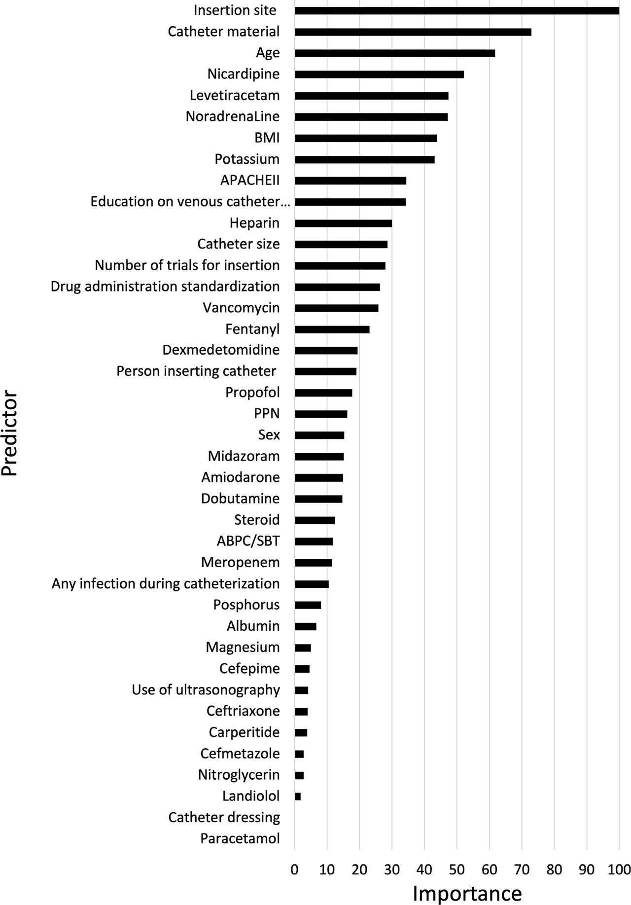 Forty potential variables from four variable levels were included in the prediction models and were selected on the basis of a priori knowledge [3,4,5,6,7,8,9,10,11,12,13,14] and clinical perspectives. These included ICU characteristics (education of nurses regarding venous catheter management and standardised drug administration measures in the ICU); patient-level variables (age, sex, body mass index, APACHE II score, and presence of infections during catheter dwelling); catheter-level variables (designation of medical staff inserting the catheter, number of insertion attempts, use of ultrasonography, catheter insertion site, catheter gauge, type of dressing, and catheter material); and drug-level variables (fentanyl, heparin, propofol, nicardipine, dexmedetomidine, ampicillin/sulbactam, albumin, paracetamol, potassium, meropenem, steroid, ceftriaxone, vancomycin, magnesium, peripheral parenteral nutrition, phosphorus, noradrenaline, carperitide, midazolam, nitroglycerin, dobutamine, cefmetazole, amiodarone, cefepime, levetiracetam, and landiolol). The types of drugs included in the prediction model were limited to those administered via more than 1% of all PIVCs and were associated with a phlebitis incidence of more than 5% on the basis of clinical considerations. The standardised drug administration measures in the ICU in the current study were defined in accordance with the documented standard operating procedures for drug administration, which was supervised by a pharmacist at the institution, and included the drug’s composition, choice of route of administration, administration rate, and contraindications to compounding.