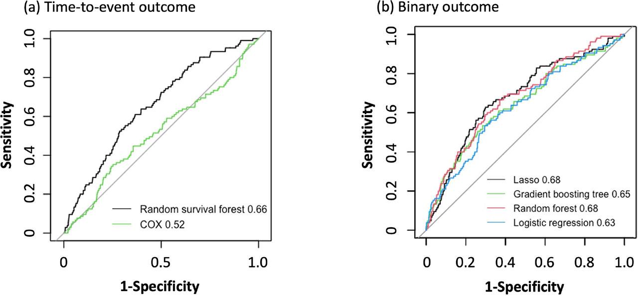 Receiver operating characteristic (ROC) curves of each model in the development set. (a) The c-statics (95% CI) of the models for time-to-event outcomes; random survival forest: 0.645 (0.606–0.684), and Cox proportional hazards model: 0.581 (0.542–0.621). The black and green lines represent the random survival forest and Cox proportional hazards models, respectively. (b) The c-statics (95% CI) of the models for binary outcomes: LASSO, 0.699 (0.662–0.736); random forest, 0.980 (0.973–0.986); gradient boosting tree, 0.892 (0.870–0.914); and logistic regression, 0.725 (0.688–0.762). The black, red, green, and blue lines represent LASSO, random forest, gradient boosting tree, and logistic regression, respectively. CI: Confidence interval