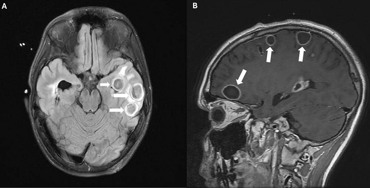 A and B Axial MRI images demonstrating resolving brain abscesses. White arrows highlight the reduced size of abscesses