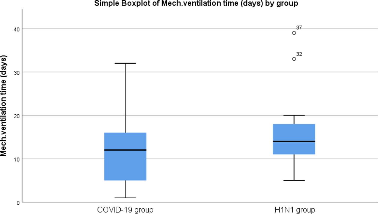 Comparison of ARDS patient outcomes between COVID-19 and H1N1 concerning mechanical ventilation duration.