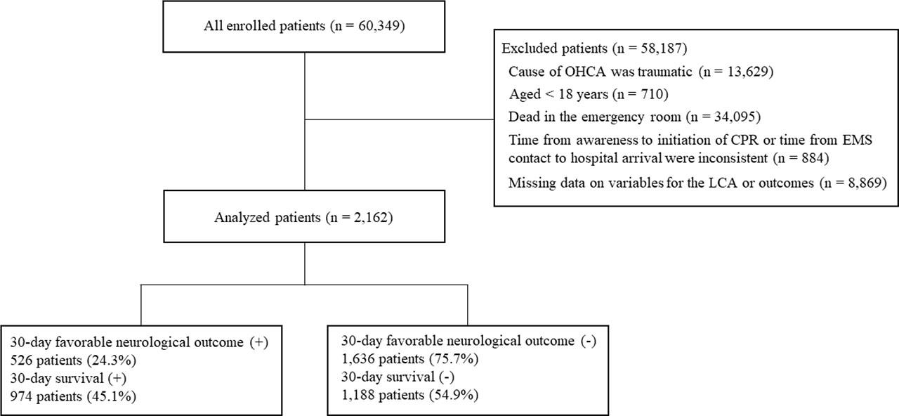 We included OHCA patients performed CPR by emergency medical services (EMS) personnel. The exclusion criteria were as follows: 1) traumatic OHCA, 2) age < 18 years, 3) dead in ER, 4) inconsistent time from awareness to initiation of CPR or time from EMS contact to hospital arrival (i.e. negative values or outlier values > 2× the third quartile range—based on the findings of a previous study), and 5) missing data concerning LCA variables or outcomes [8].
