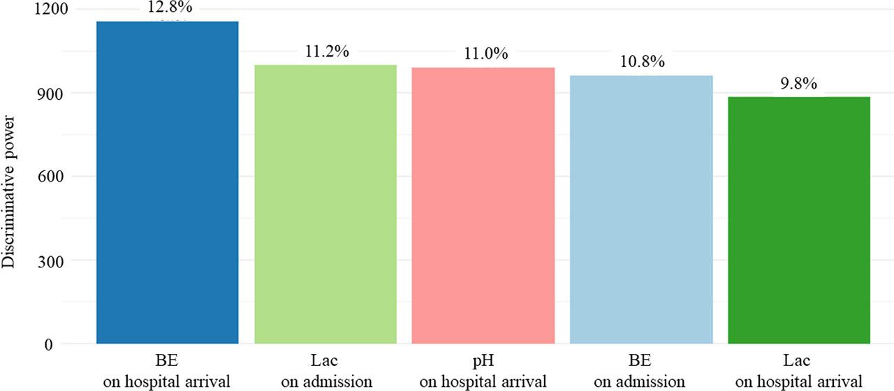 The five factors with high discriminative power in the LCA. Abbreviations: BE, base excess; Lac, lactic acid; LCA, latent class analysis. All of these variables were blood gas findings.