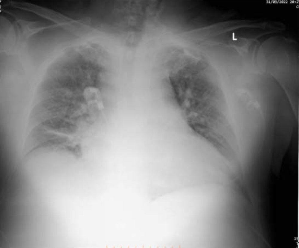 He had derangement of his lab workup, as follows: Creatinine (Cr) of 2.23 (0.55 to 1.30 mg/dL normal), blood urea nitrogen (BUN) of 100 (14 to 39 mg/dL normal), Glycemia 303 mg/dL, Troponin I 0.218 (< 1.0 ng/mL normal). His blood count (CBC) showed WBC 10.42x103qe/μl, RBC 3.75x105qel/μl, Hb 10.7 g/dL. An arterial blood gas (ABG) a pH of 7.31, hyperkalemia K+of 6.54 mEq/L (3.8–5.0 mEq/L normal), base excess (BE) of −11.1, (−2/+2 normal). The thoracic X-Ray revealed opacification of both lungs, probably pulmonary edema. Figure 1